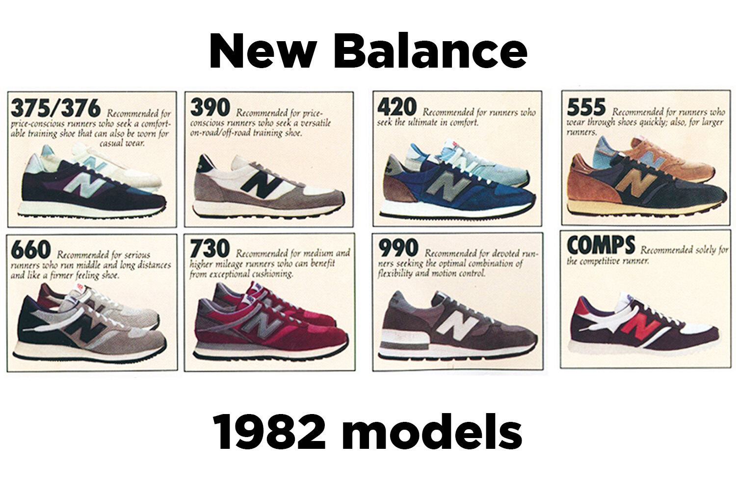 Наприкінці 1970-х у New Balance вирішили нумерувати моделі кросівок замість називати абстрактними словами, щоб покупці бачили: всі моделі рівні, але призначені для різних цілей. Іншим важливим рішенням став вибір сірого кольору для бігових кросівок — на противагу білому взуттю міських бігунів, яке швидко забруднювалося.