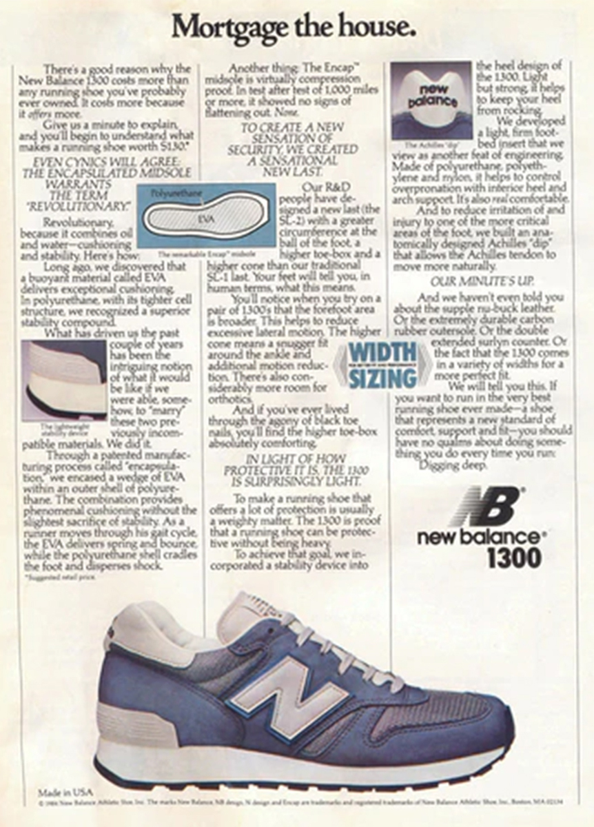 І хоча початково успіх ідеї CEO New Balance Джима Девіса сприйняли скептично, розраховуючи на невеликий попит, за перші пів року з відкриття продажу компанія отримала 50 тисяч замовлень. Це надихнуло бренд випустити бігові кросівки 1300 за 130 доларів (що сьогодні дорівнює понад триста доларів) із зухвалою рекламою зі слоганом «Закладіть будинок».