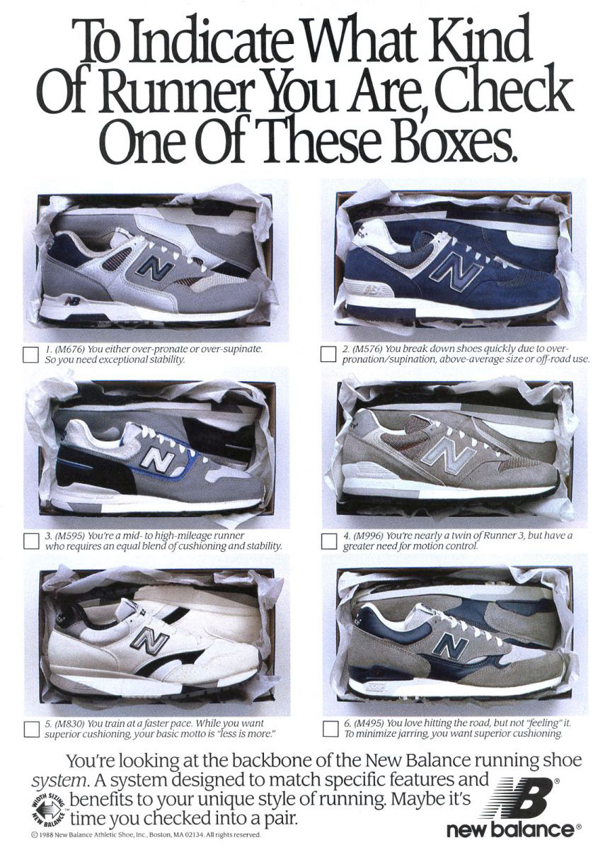 1989 року американський бренд випустив рекламу, в якій демонстрували різні види кросівок, що найкраще відповідають різним біговим стилям. Чотири з шести представлених моделей були сірого кольору. Силуети M676 і M595 забезпечували «виняткову стабільність», M495 — «чудову амортизацію», а М996 — «кращий контроль руху».