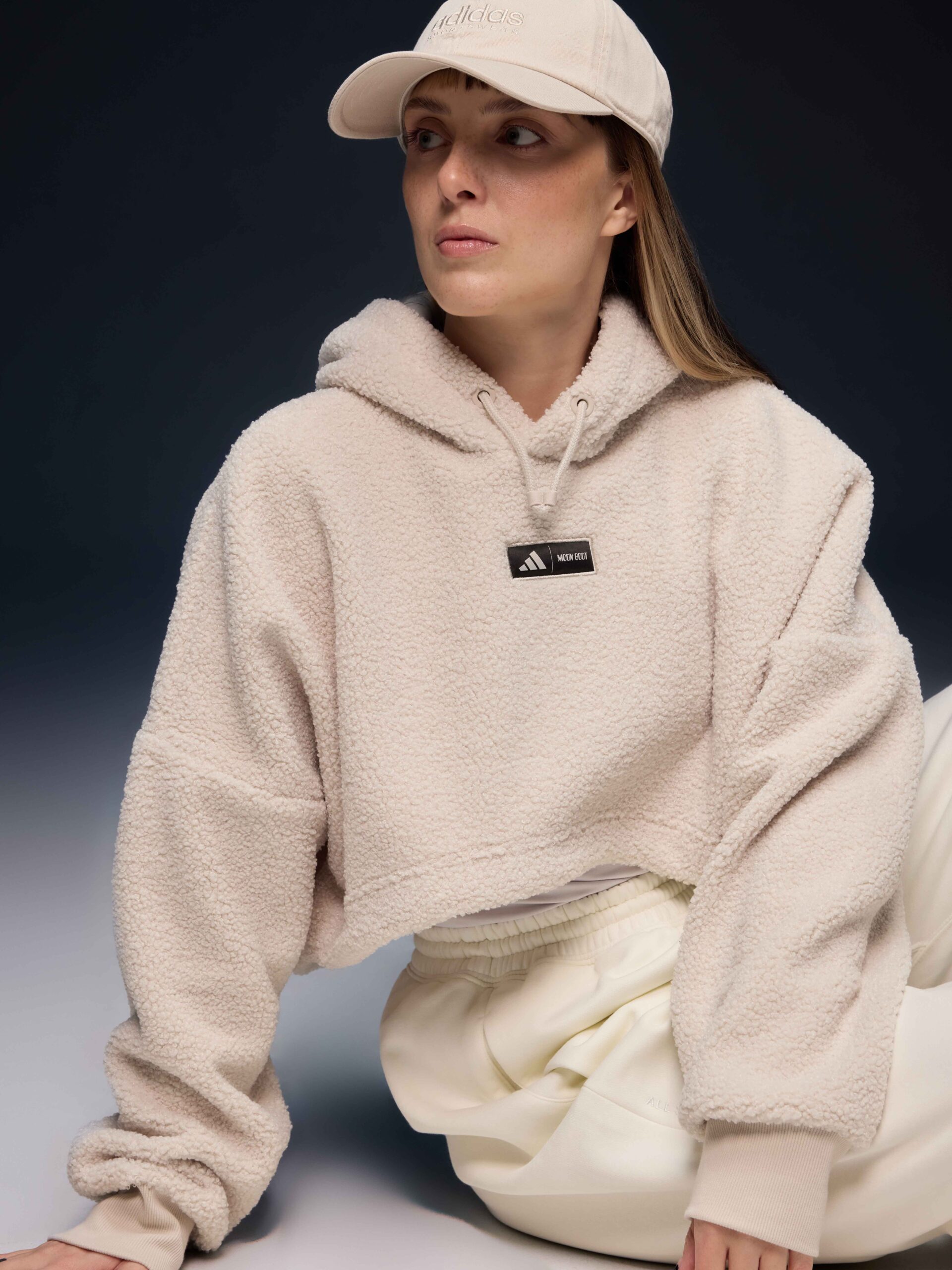 Так, пухнастий кроп-гуді поєднали зі спортивними штанами, бейсболкою і кросівками, до спортивного костюма в клітинку тартан додали світлі акценти — футболки та кросівки, що перегукуються з фірмовими смужками на костюмі. А образ з легінсами збалансували через багатошаровий верх.