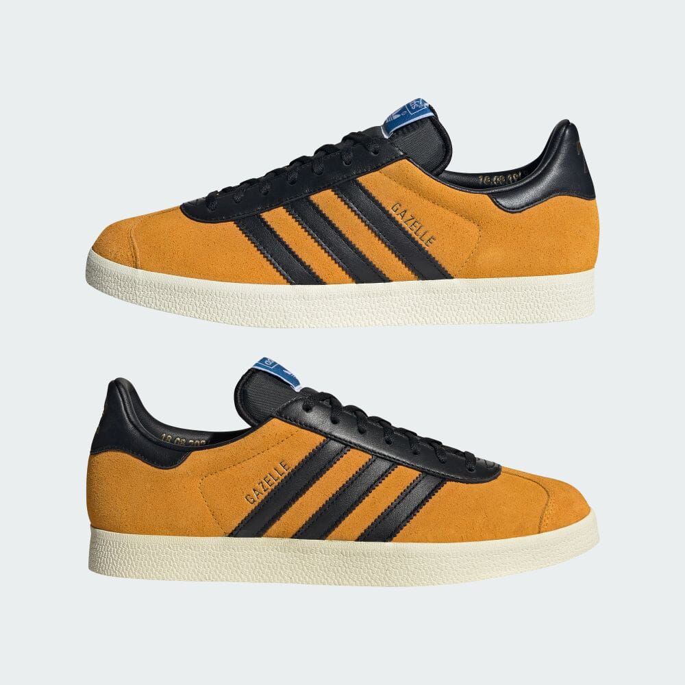 Верх adidas Gazelle виготовлений з замші, зі шкіряним задником та трьома смужками збоку. У колекції пара представлена у помаранчево-чорному колорвеї.