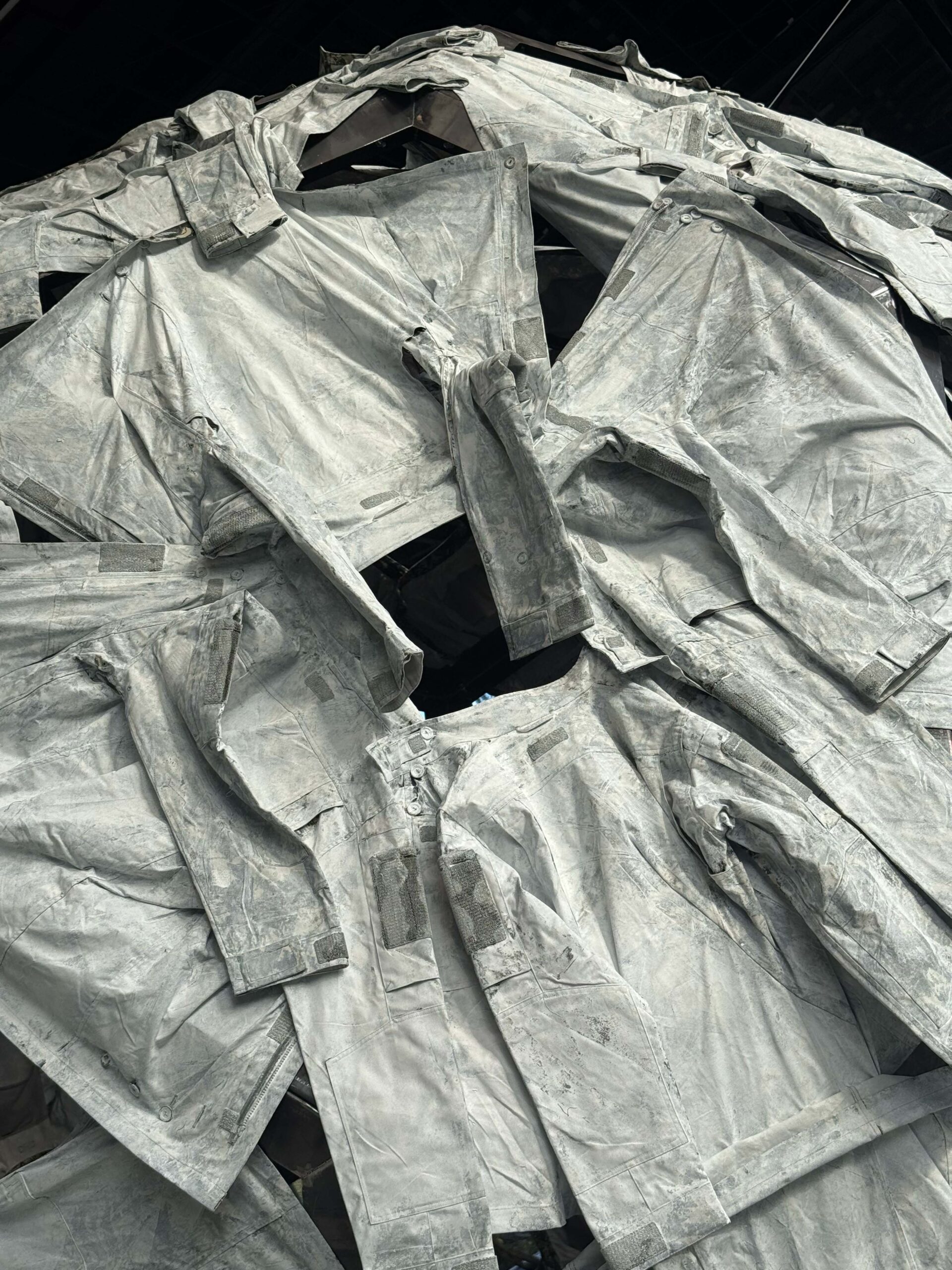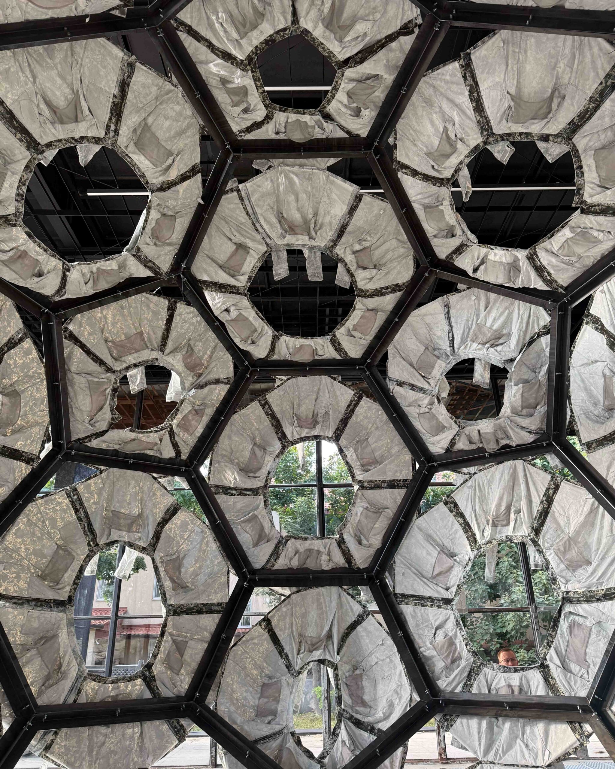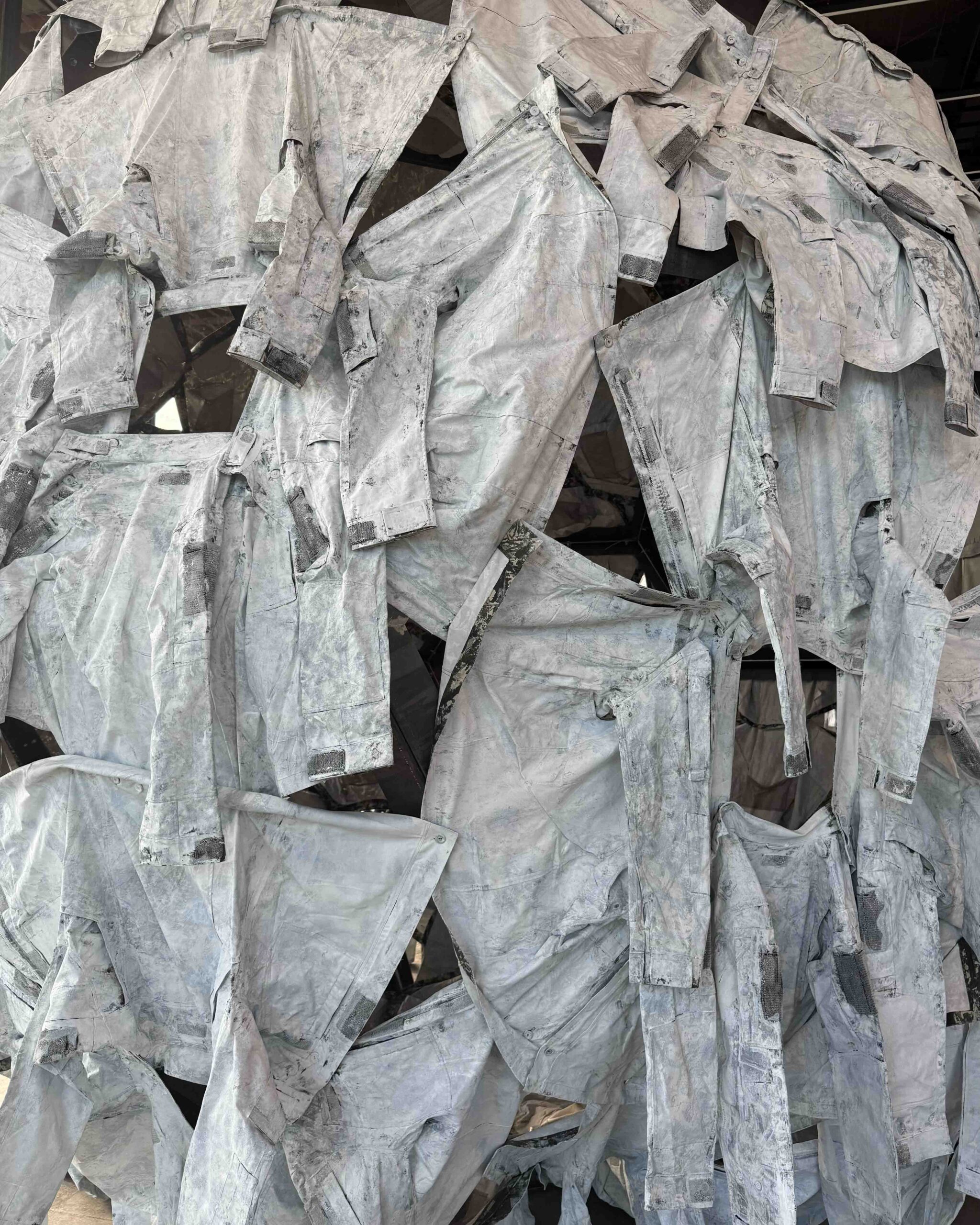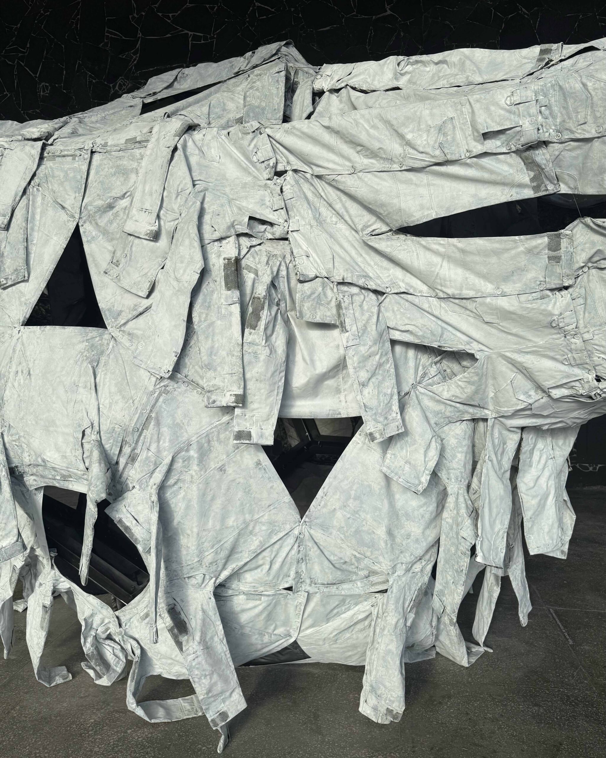 Кожну зі сфер обгорнули видозміненими піксельними та камуфляжними військовими сорочками, покритими білою фарбою — натяк на «на ідеологічне відбілювання та приховування фактів».