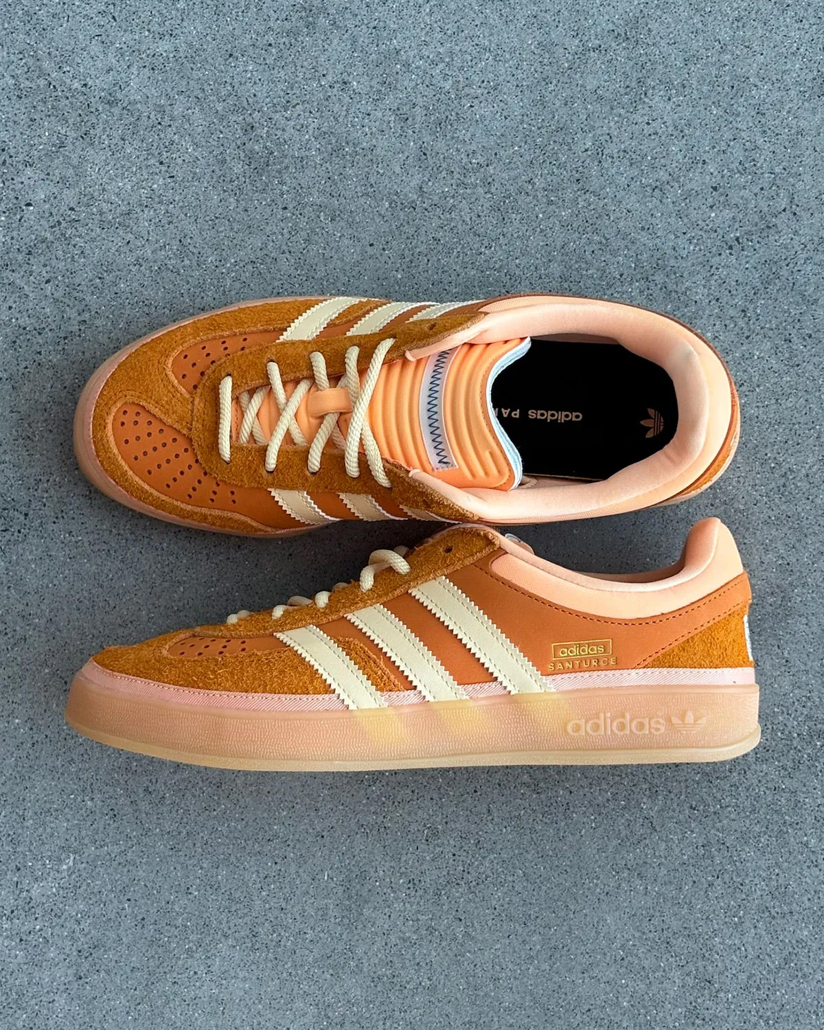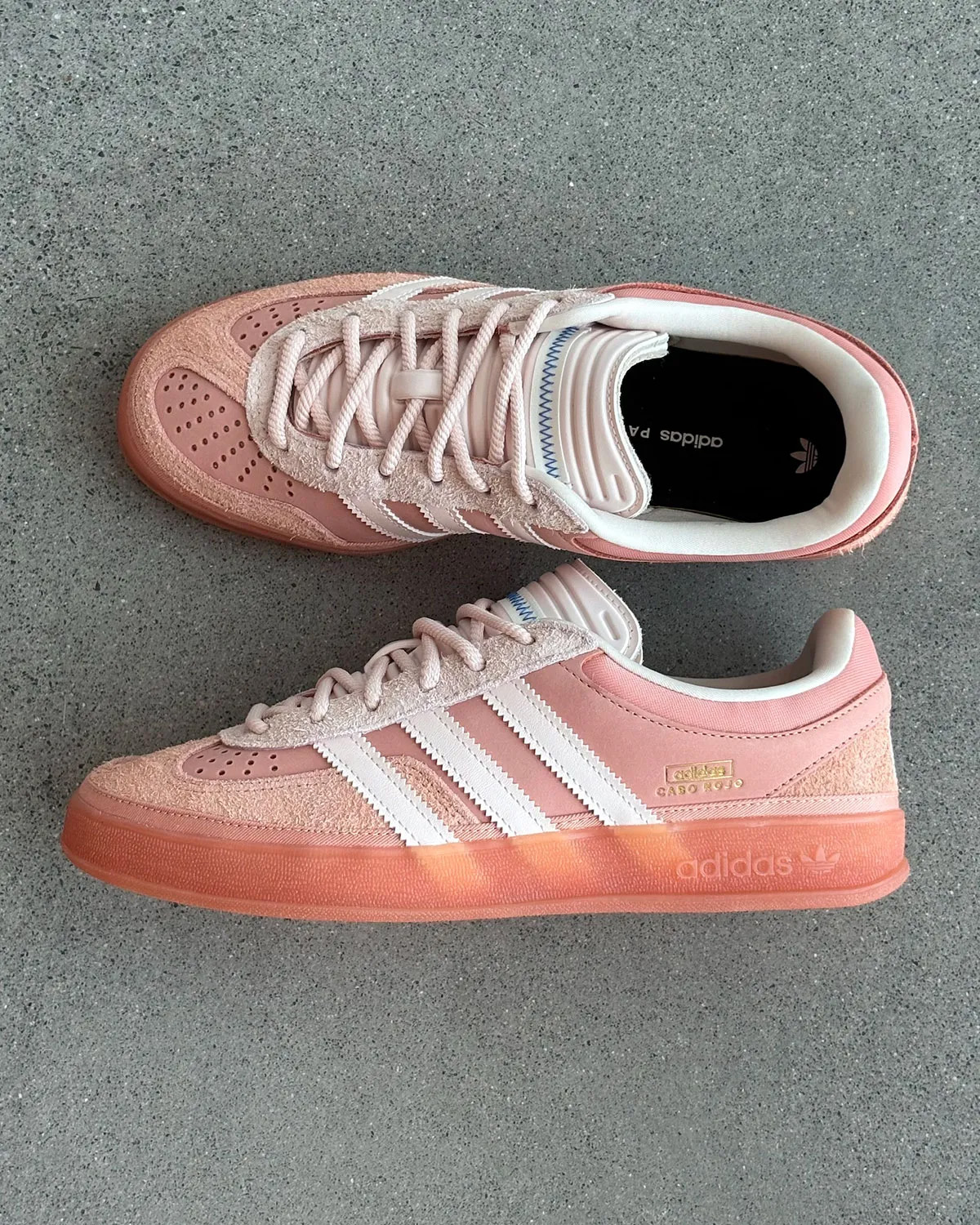 Кеди виготовили з замші та шкіри, доповнивши потовщеним задником та накладкою на носок — на відміну від класичних adidas Gazelle, її змістили від центру.
