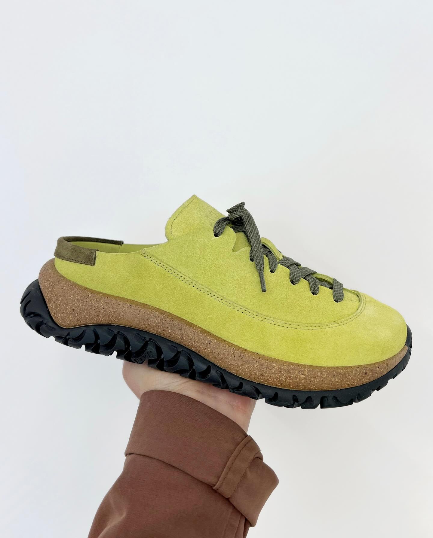 Мінімалістичну модель Uerzell без задника виготовили із замші, оснастивши корковою підошвою та доповнивши накладкою на п’ятку і шнурівкою.