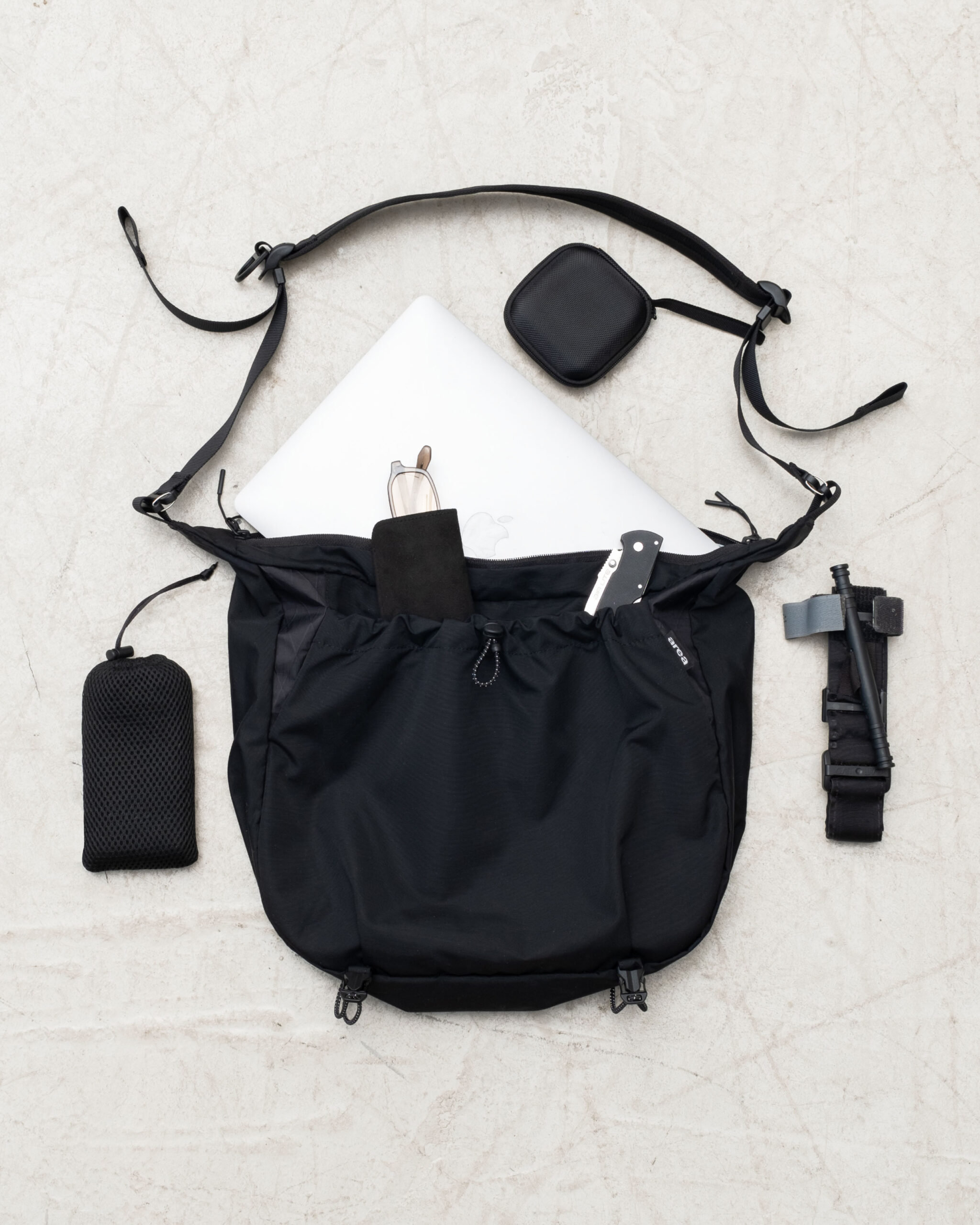 Сумки виконали з нейлону у параметрах 33 см на 28 см на 7 см. Сумку оснастили внутрішніми відділами для зберігання, нижніми фіксаторами для закріплення речей.