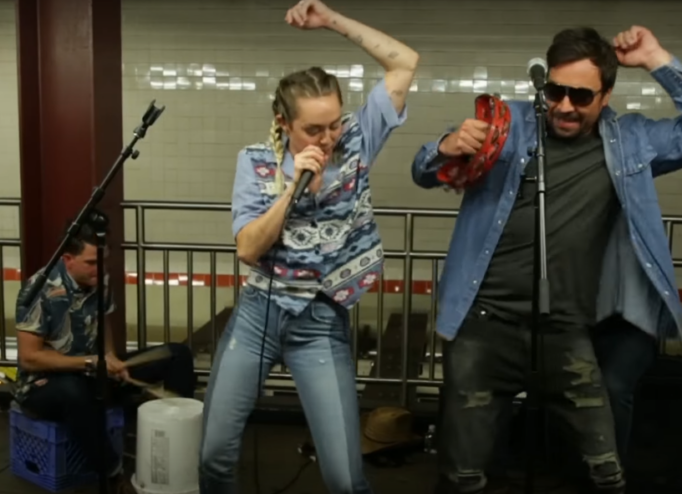 Майли Сайрус и Джимми Фэллон спели в метро Нью-йорка
