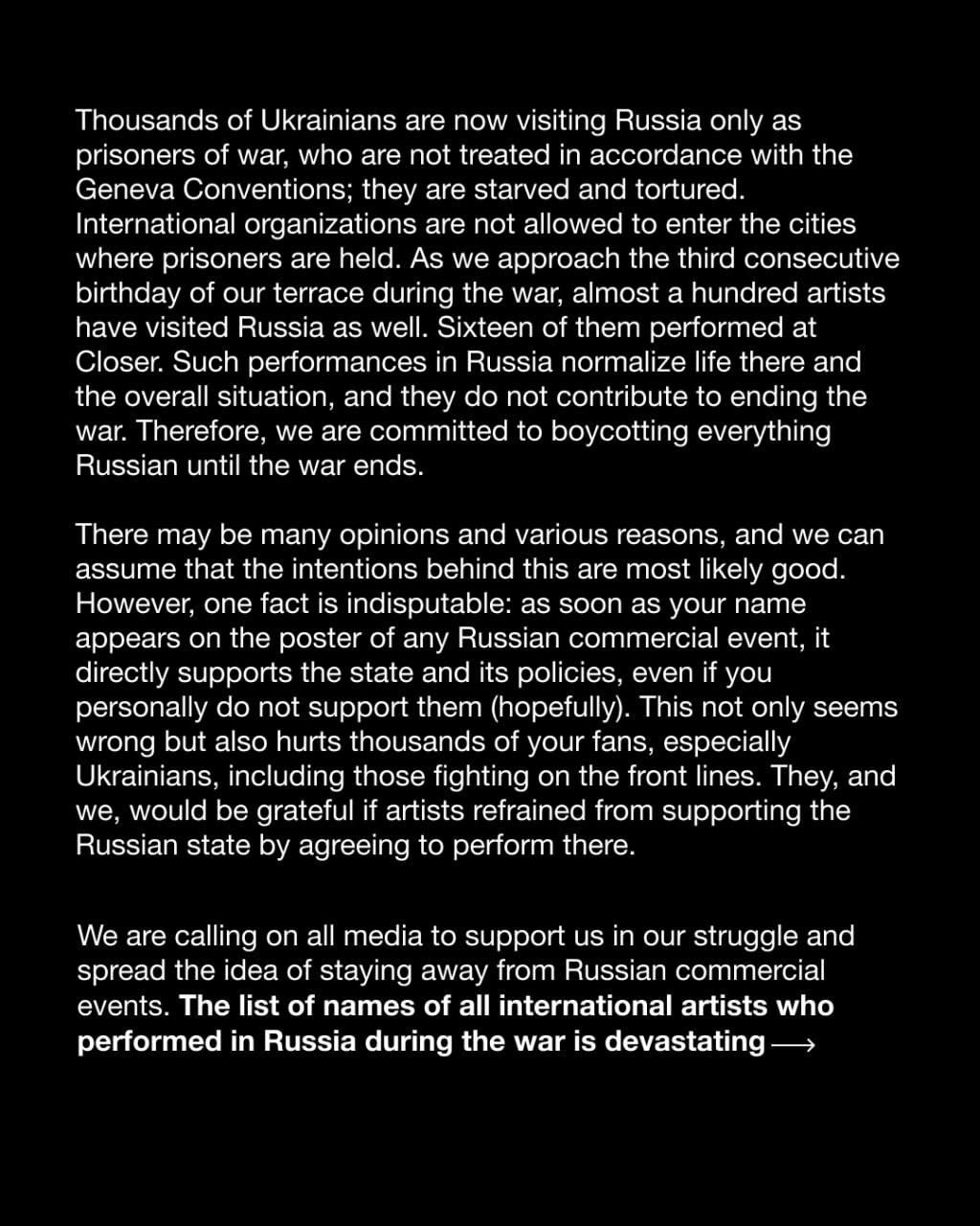 Ми закликаємо всі медіа підтримати нас у нашій боротьбі та поширити ідею триматися подалі від російських комерційних заходів. Список імен усіх міжнародних артистів, які виступали в росії під час війни, — катастрофічний».