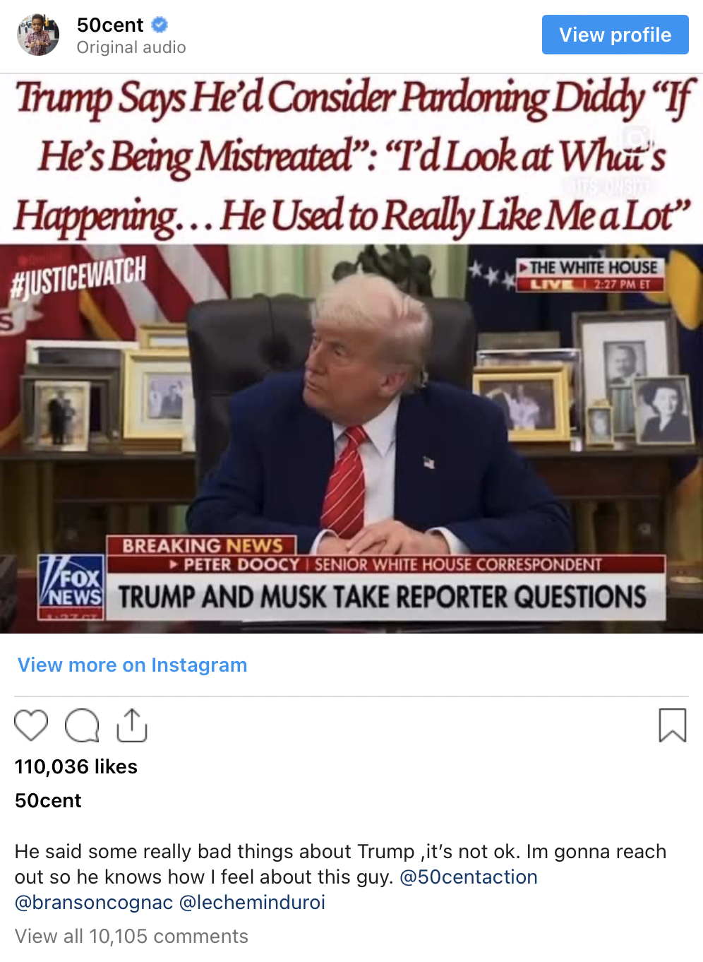 Репер 50 Cent першим серед медійних артистів публічно відреагував на слова Дональда Трампа. У вже видаленому пості в інстаграмі, який цитує Rolling Stone, він написав, що планує поговорити з президентом та переконати не підписувати помилування для Шона Комбса, який «говорив про Трампа дуже погані речі».