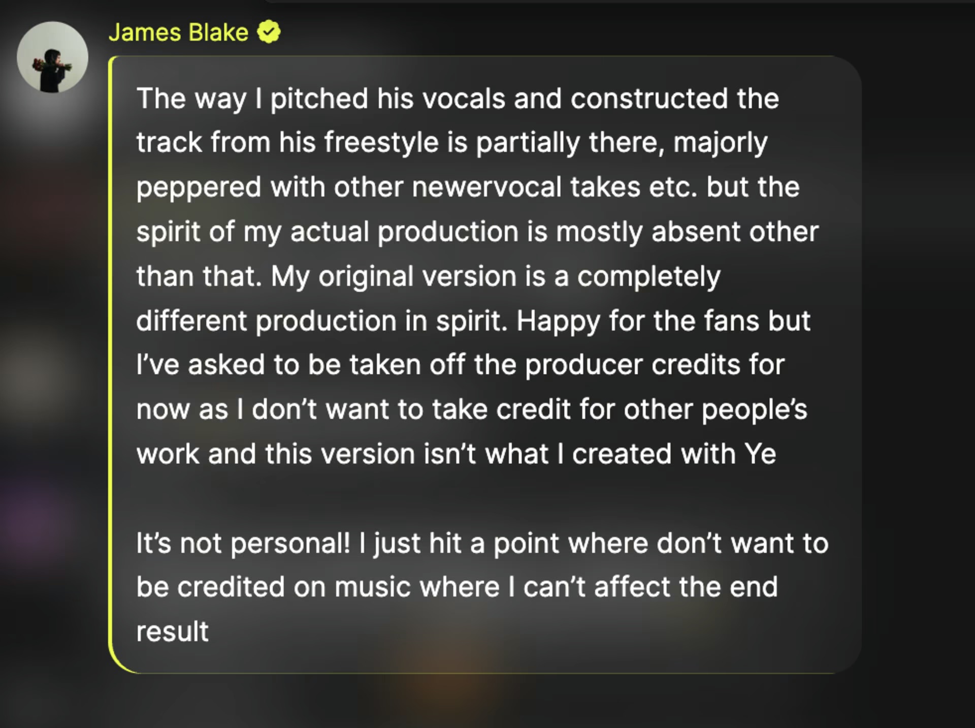 «Те, як я обробив його вокал і побудував трек на основі його фристайлу, частково збереглося, але більшою мірою це доповнили новішими вокальними тейками та іншими деталями. Я радий за фанів, але попросив наразі прибрати мене з продюсерського списку, оскільки не хочу приписувати собі роботу інших людей, і ця версія — не те, що я створював разом із Каньє», — говорить співак та додає: «Нічого особистого. Я просто дійшов до моменту, коли не хочу бути вказаним у музиці, на фінальний результат якої не можу вплинути».