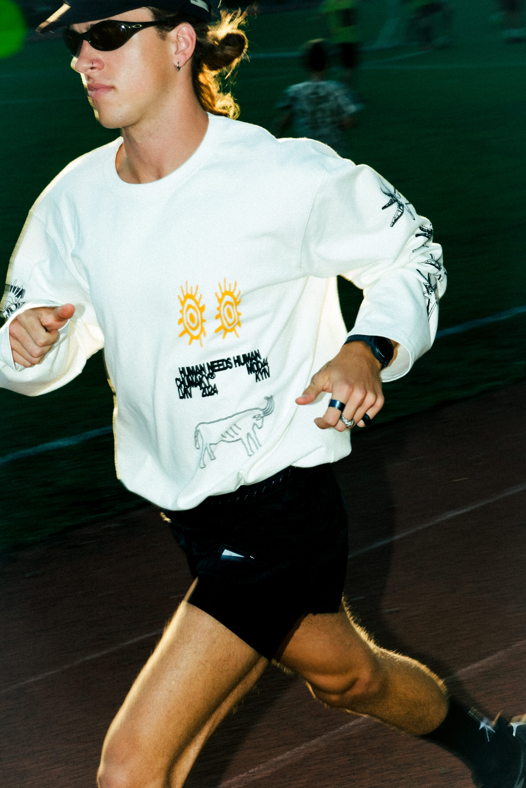 A longsleeve from the collection is decorated with drawings of a sun and a bull, similar to rock art. The slogan of the drop Human needs human and two running people are placed on the back. The sleeves are decorated with chumaky branding.