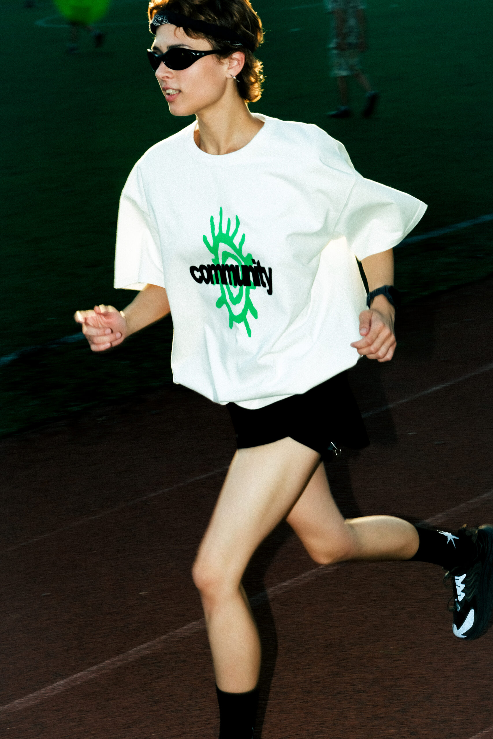 The T-shirt features a sun print with the word community on the front and the Not only runner slogan with chumaky and m0d44 branding on the back.