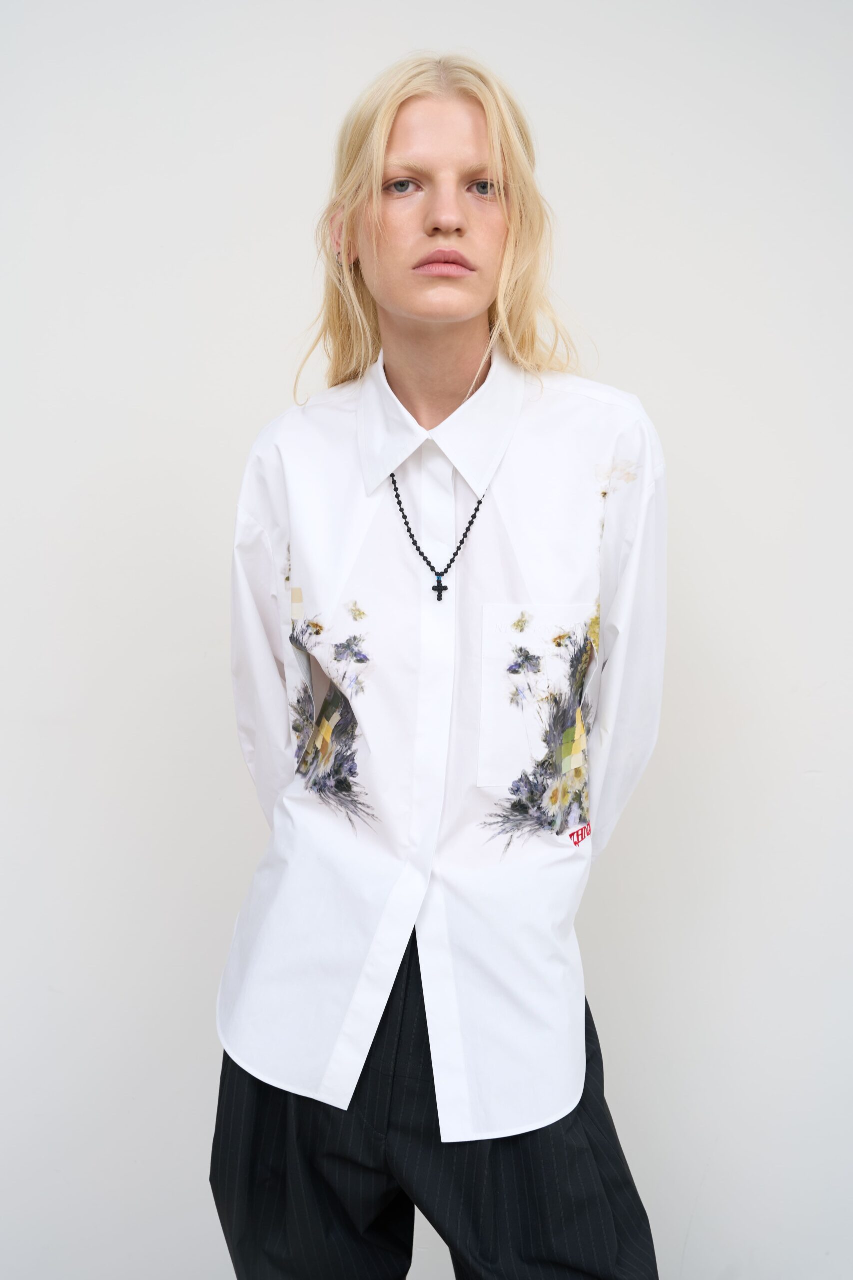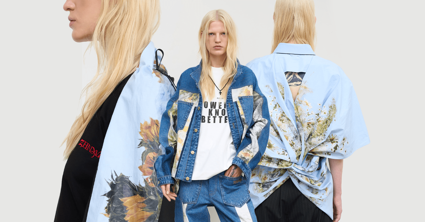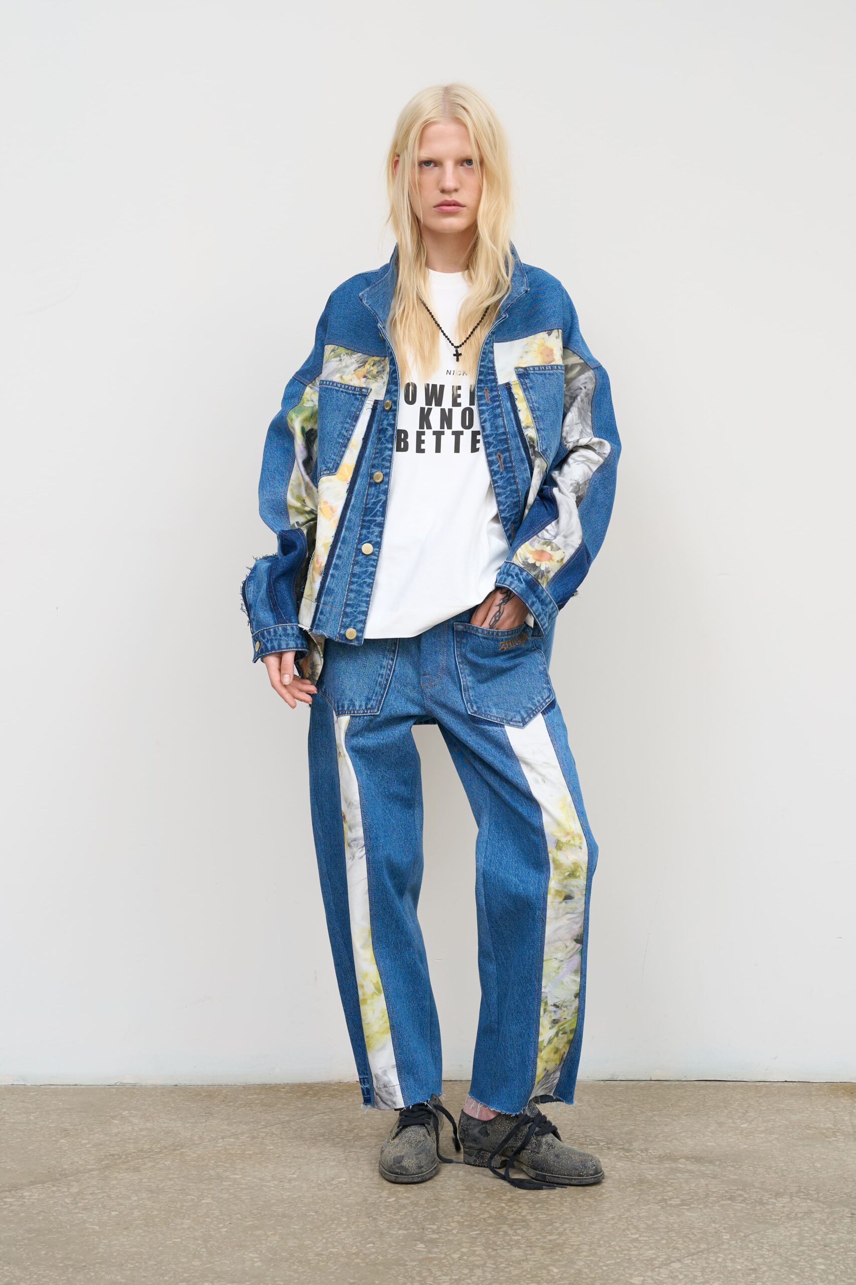 The collaborative capsule includes items united by the theme of harvest — the leitmotif of LITKOVSKA’s main collection. It features jackets, suit trousers, open-back vests, voluminous shirts and denim pieces, including skirts and jackets, as well as a T-shirt with the inscription Flowers Know Better. Nick Knight has developed floral images for the items that have been further deconstructed, embroidered and applied on fabrics, playing with the form and lines of the clothes.