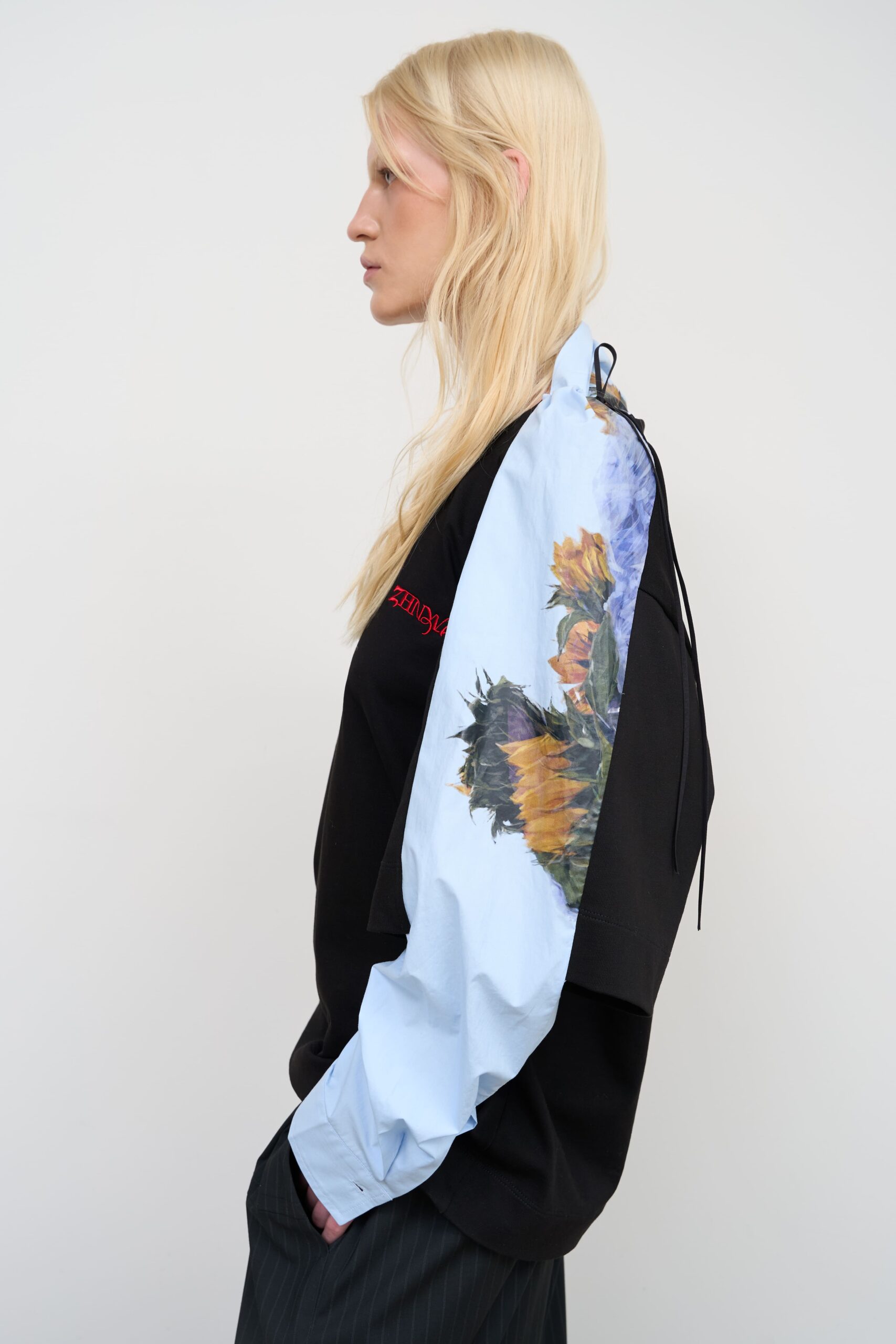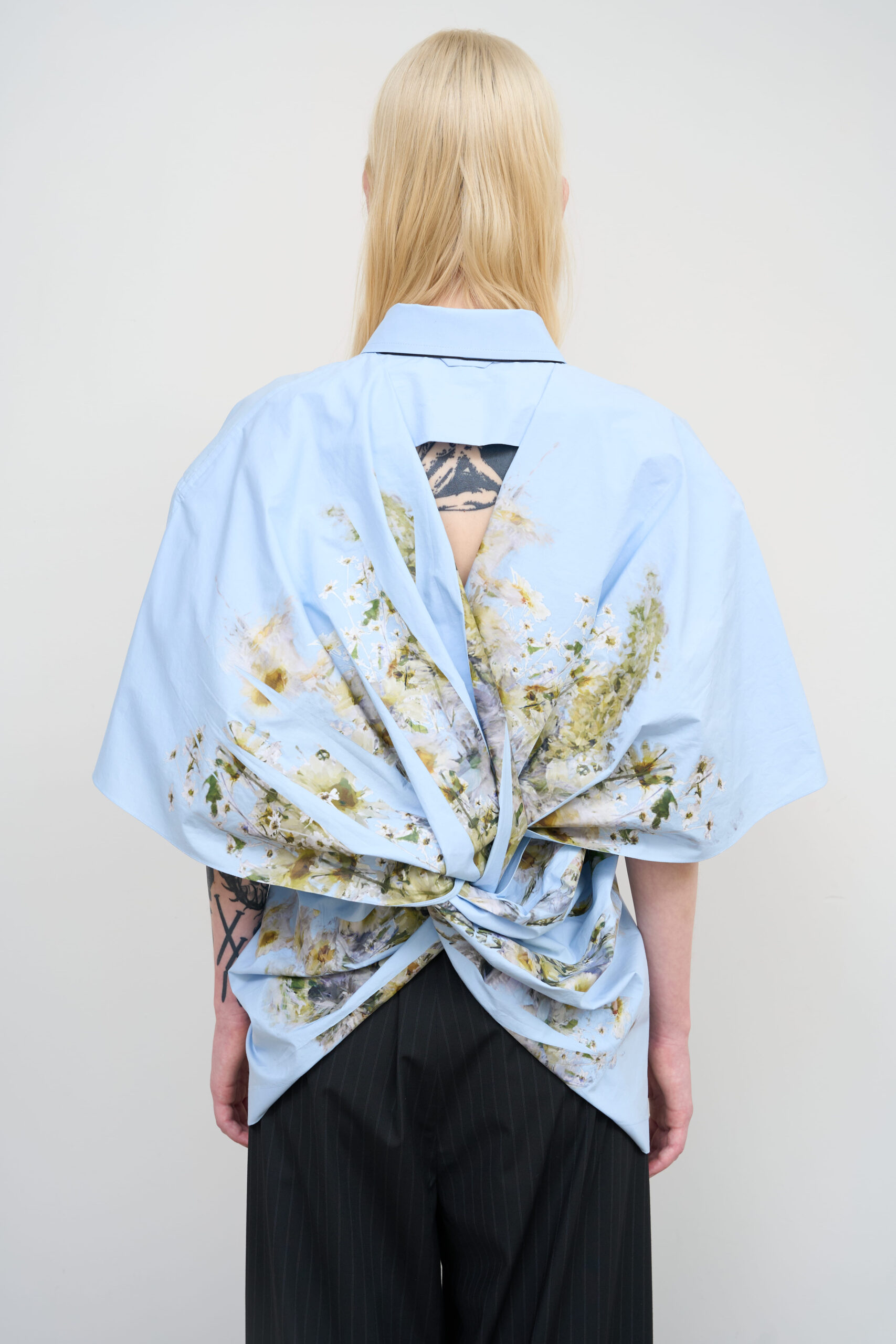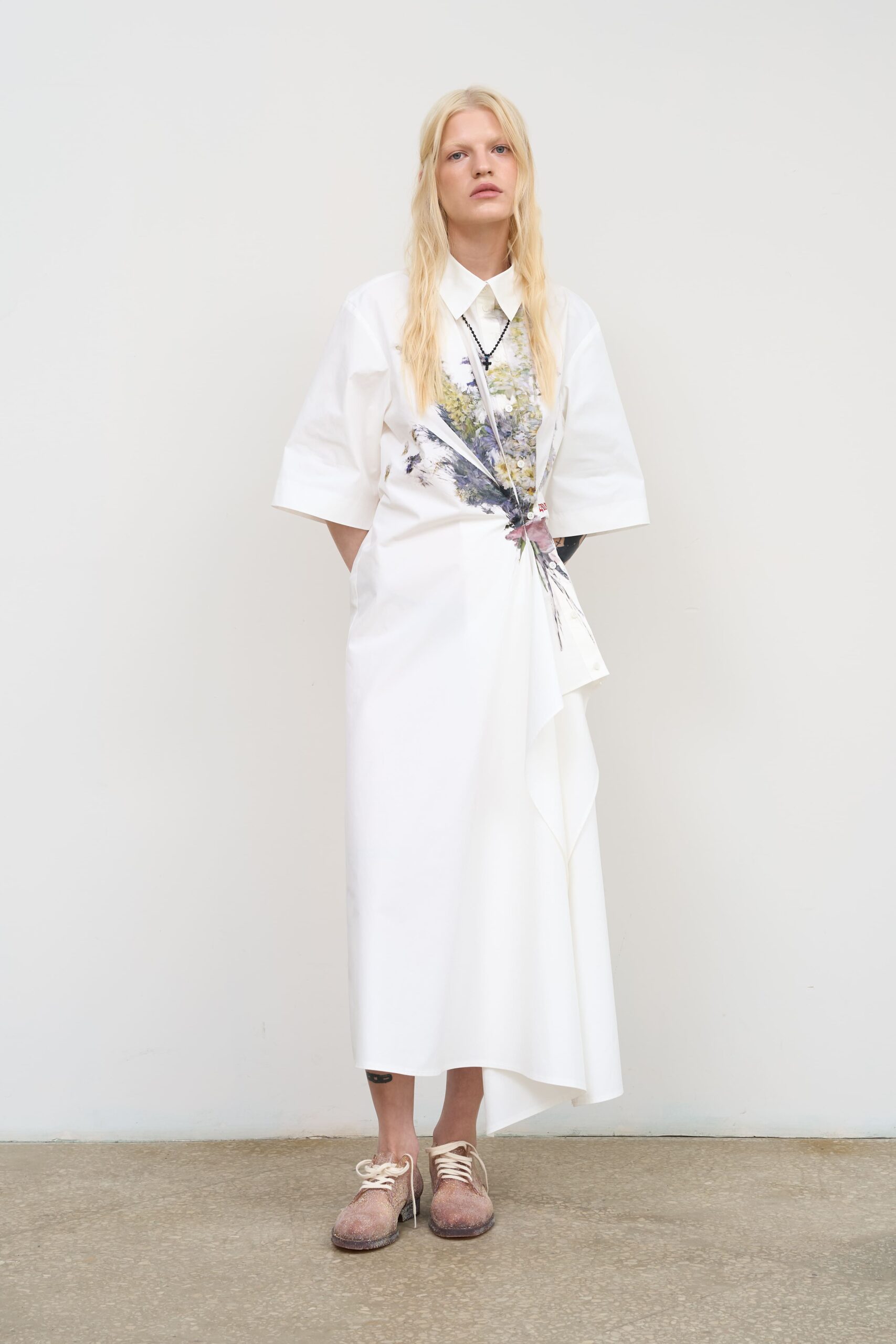 The collaborative capsule includes items united by the theme of harvest — the leitmotif of LITKOVSKA’s main collection. It features jackets, suit trousers, open-back vests, voluminous shirts and denim pieces, including skirts and jackets, as well as a T-shirt with the inscription Flowers Know Better. Nick Knight has developed floral images for the items that have been further deconstructed, embroidered and applied on fabrics, playing with the form and lines of the clothes.