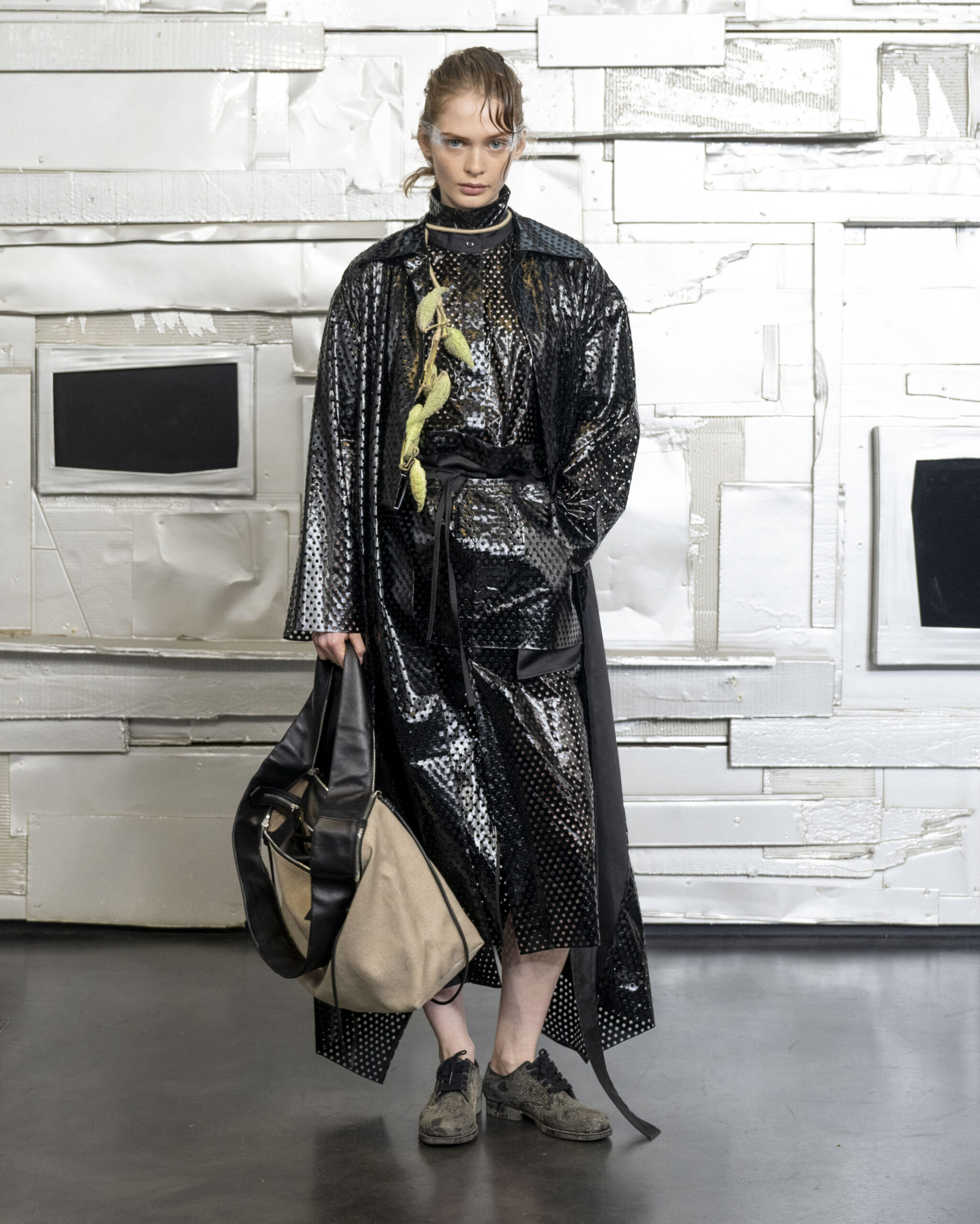 The collection also includes mesh tops and blouses with patches resembling corn tassels, asymmetric dresses and all-black outfits made of glossy faux leather.