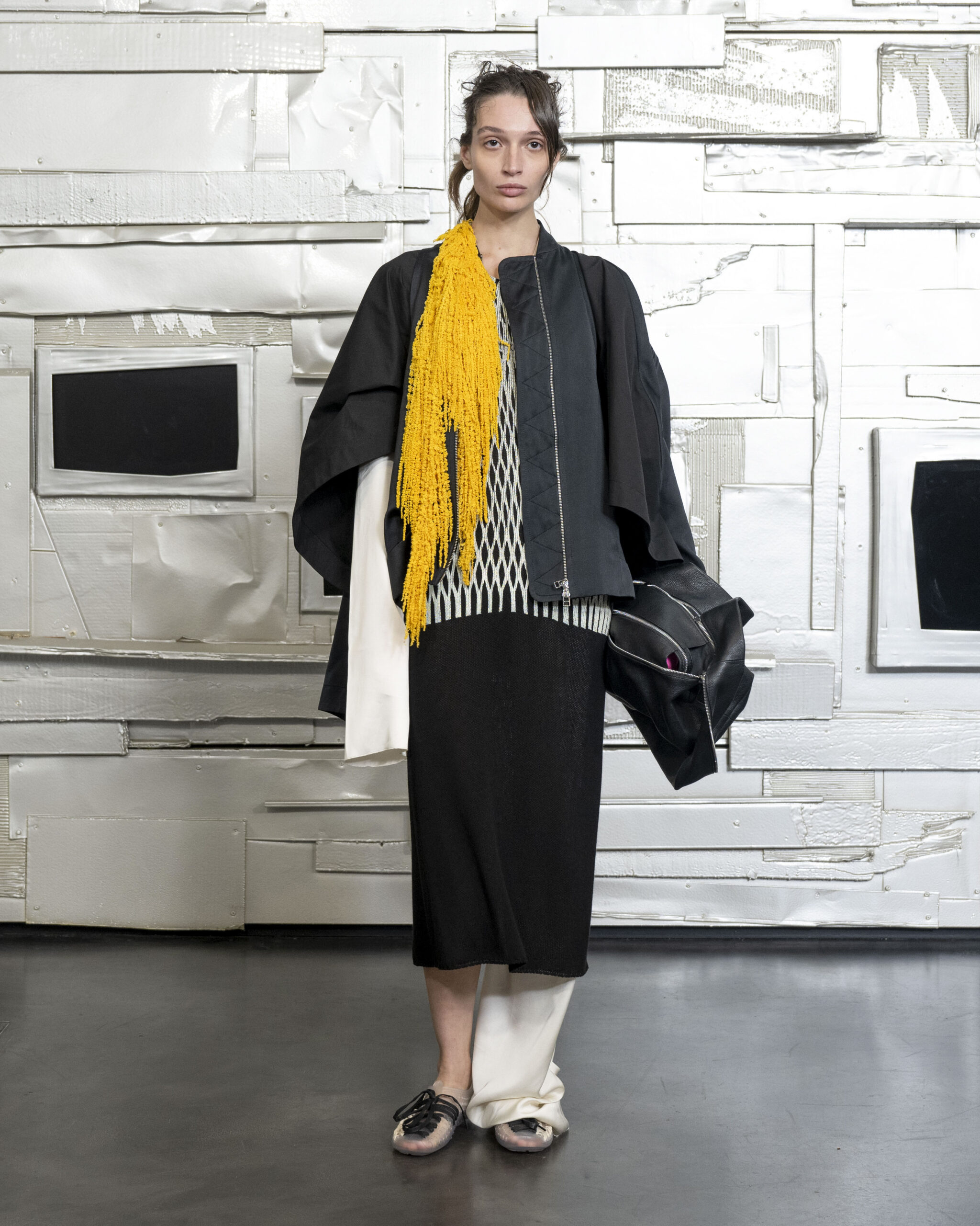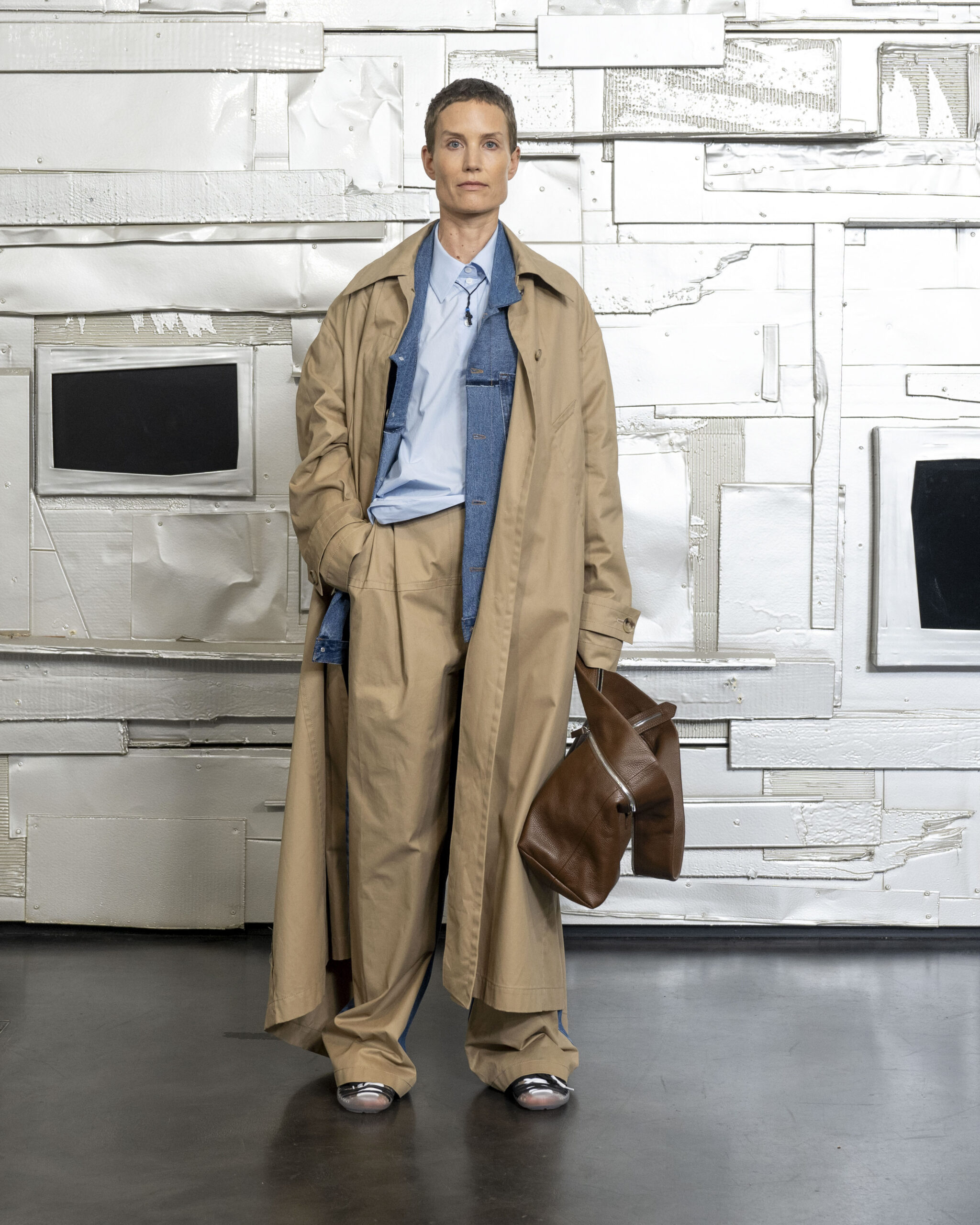The LITKOVSKA main collection features deconstructed elements of men’s wardrobe adapted for women’s clothing. Multi-layered designs, which are signature for the Ukrainian brand, can be traced in the looks with trench coats combined with several denim shirts, as well as bomber jackets presented with jackets and T-shirts.