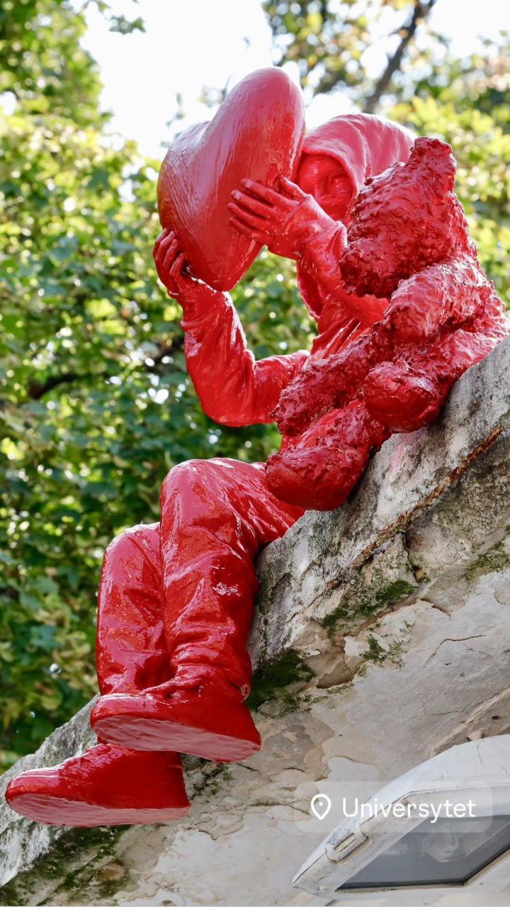 This time, the sculpture features a girl with a heart in her hands and a bear toy next to her.