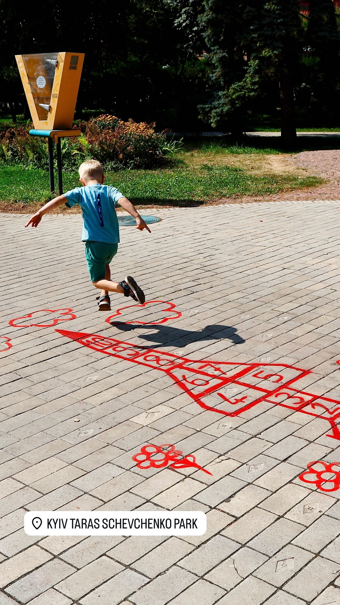 Along with his work in the form of a clockwork pigeon, Colomina posted on Instagram a drawing in Taras Shevchenko Park: he used red paint to draw the hopscotch line markings on the tiles in the shape of a rocket.
