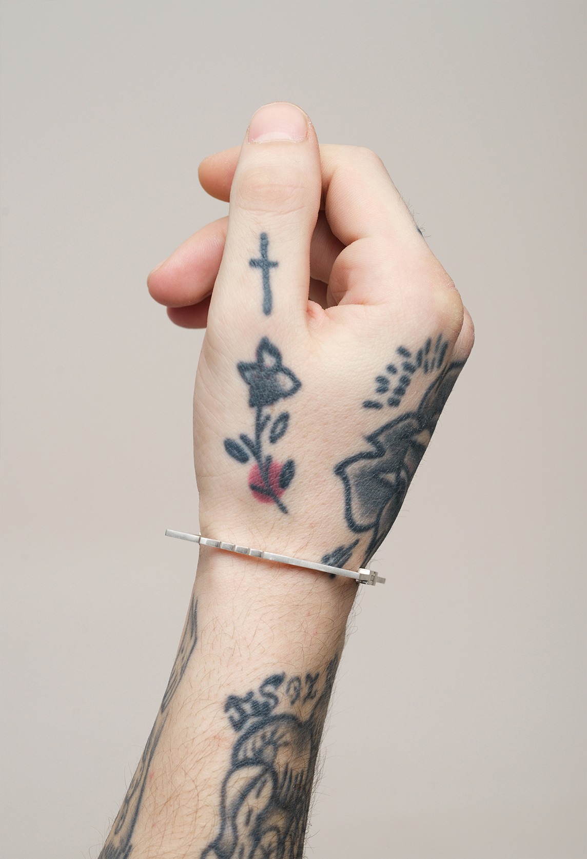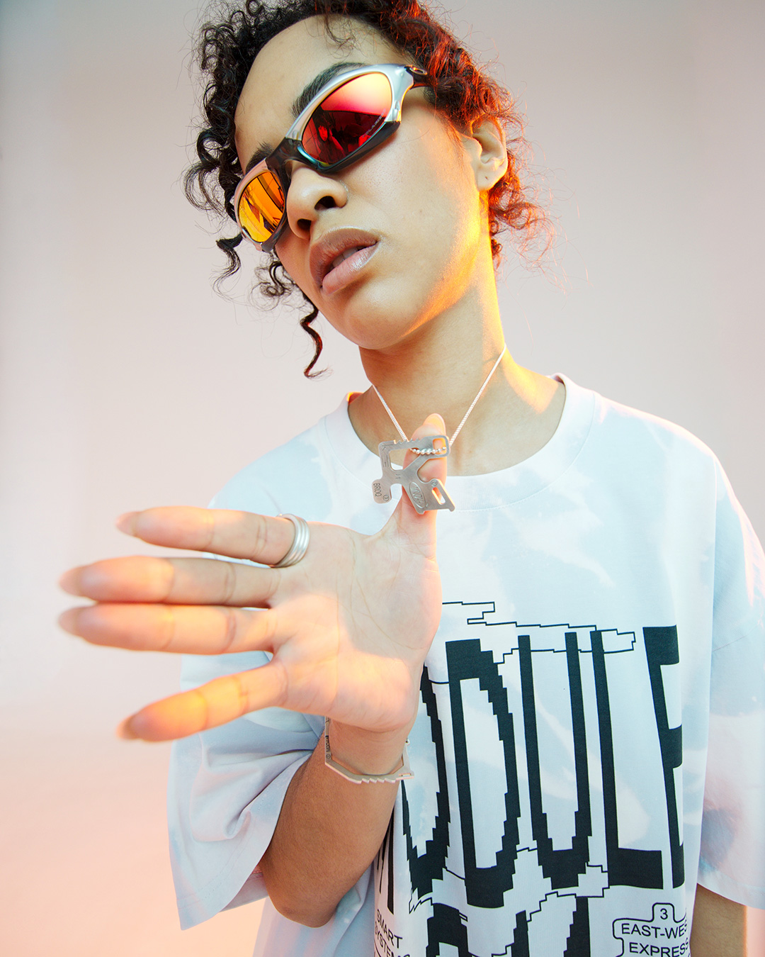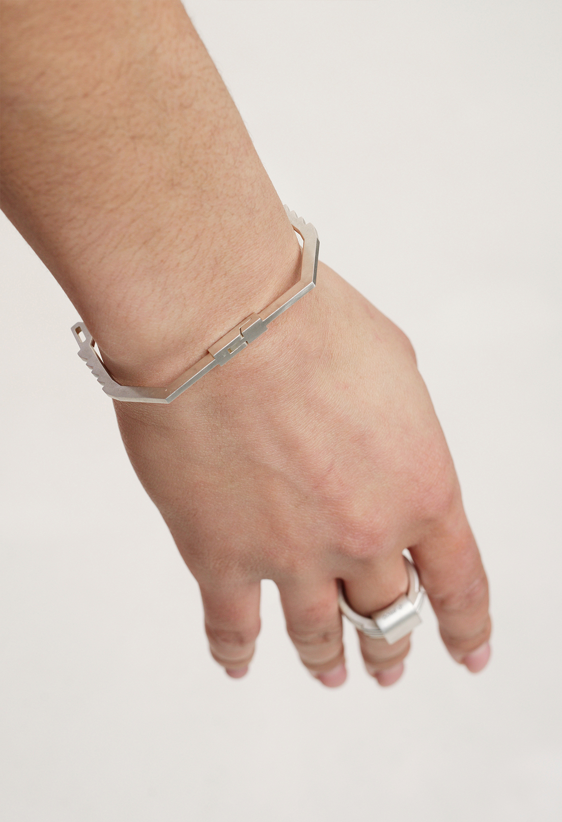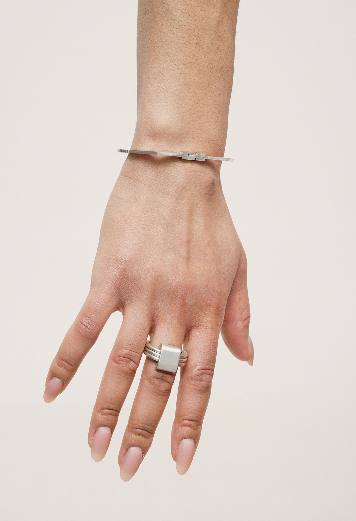 The collaborative m0d44 x Broq jewelry collection includes a silver pendant, bracelet and ring. In the collaboration, the brands wanted to combine the design and functional component of the accessories
