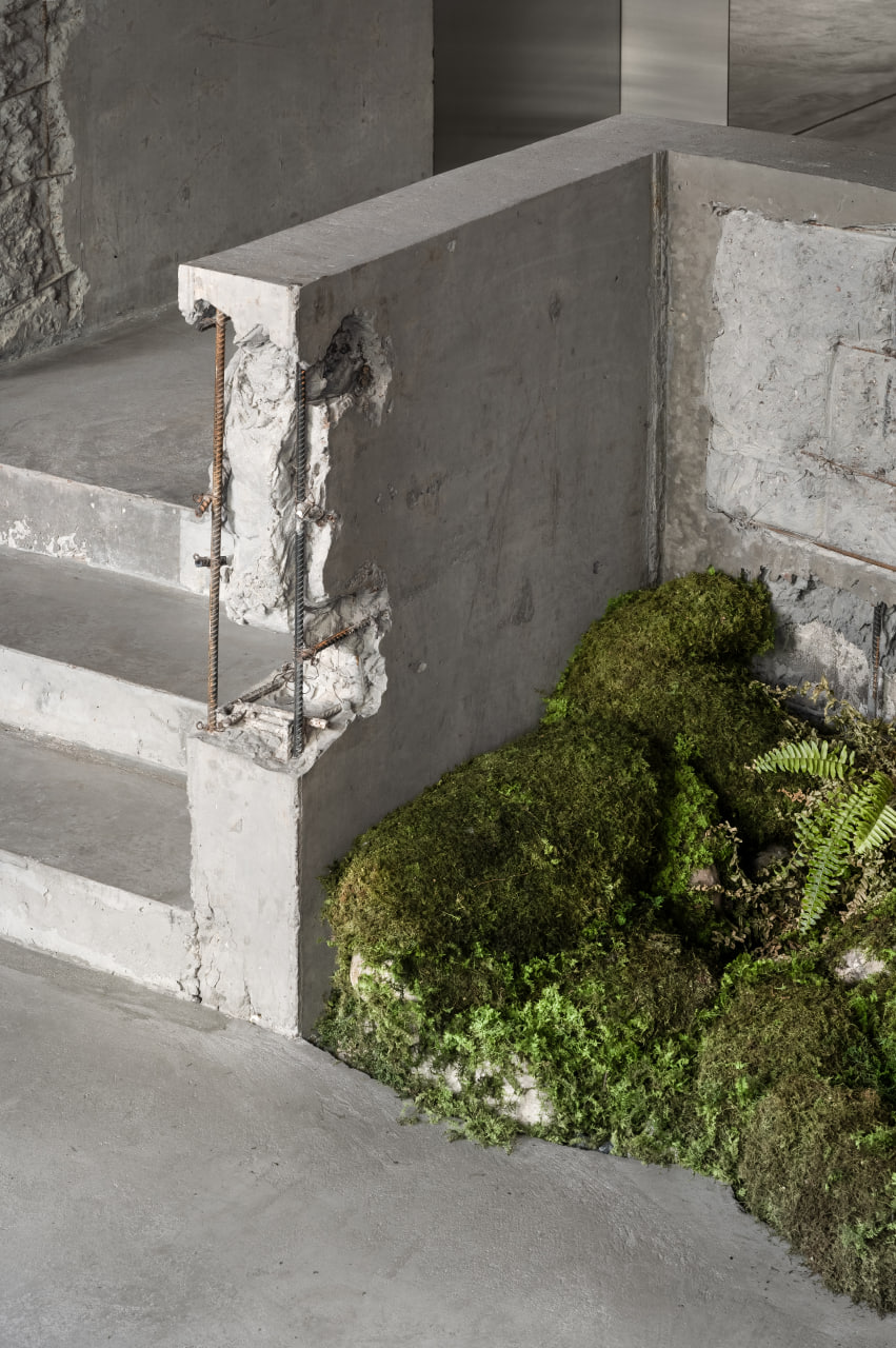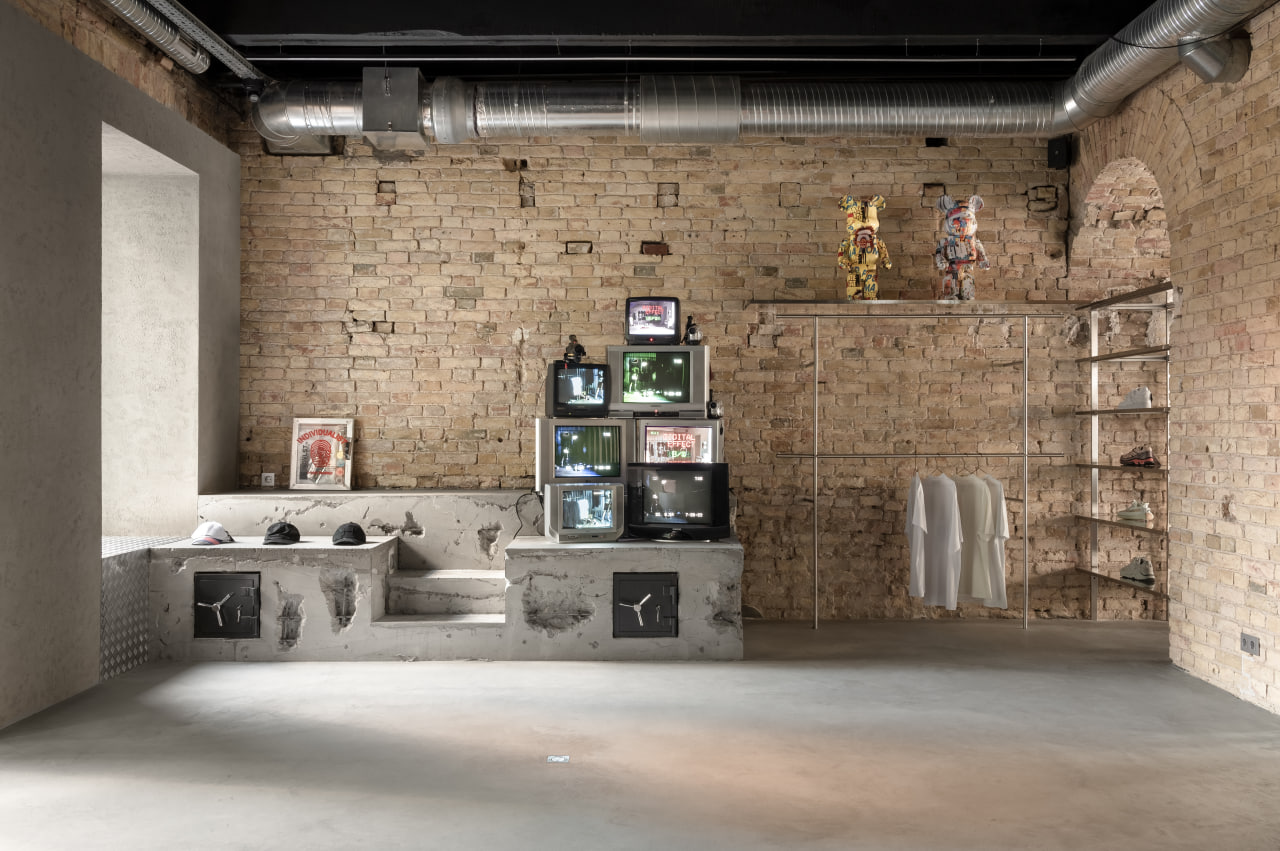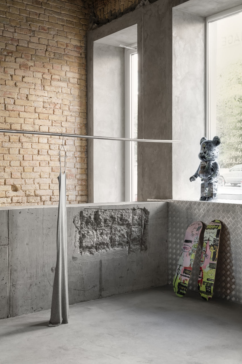 The space was designed by TEMP Project studio, which also created designs for Anoeses and Gunia Project stores. According to architect Anastasiia Tempinska, the owners of Storage X Domaine 17 wanted to convey the atmosphere of an ‘abandoned industrial zone’ with scratched concrete surfaces, exposed rebar, and plants.