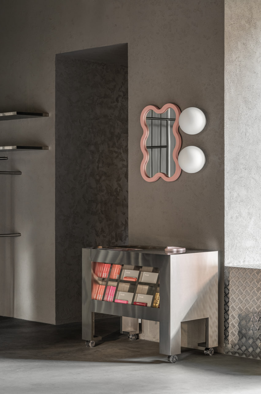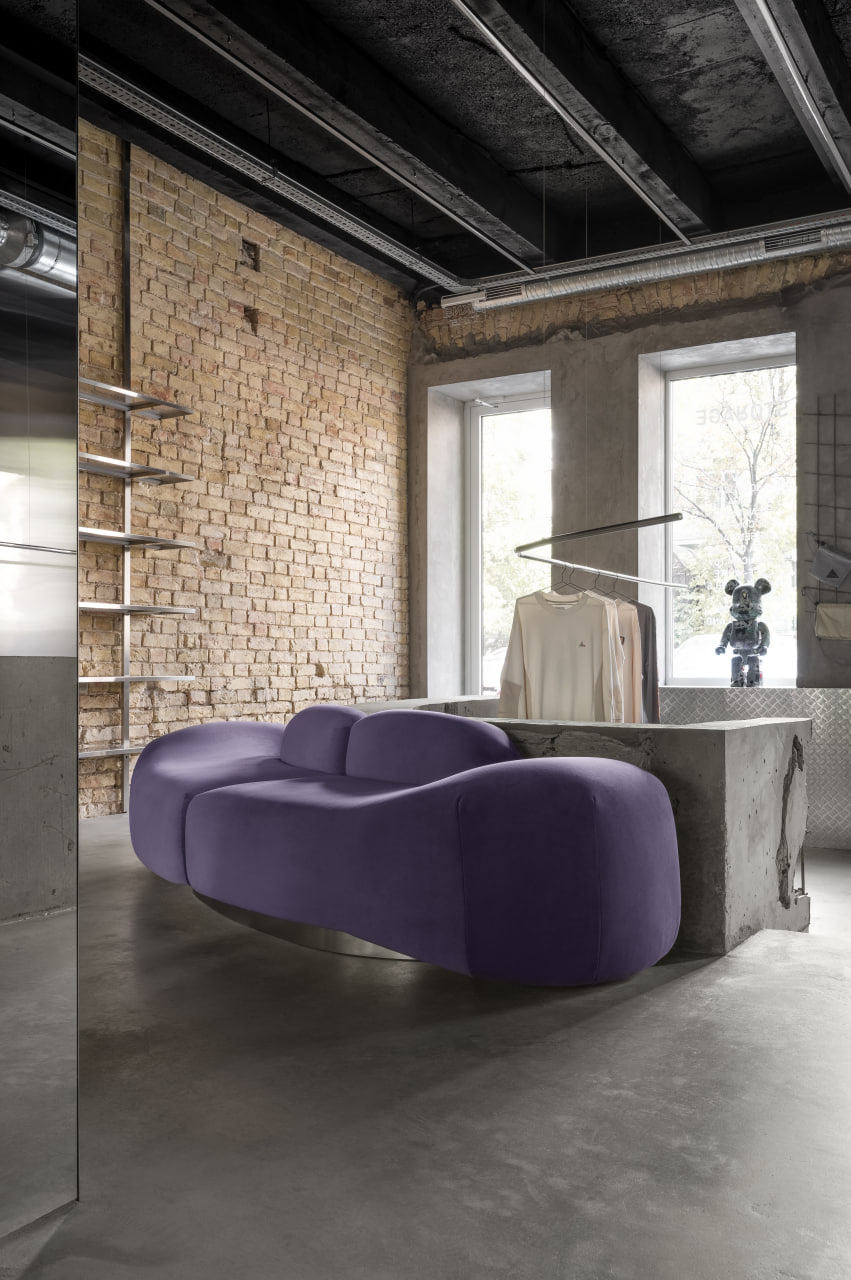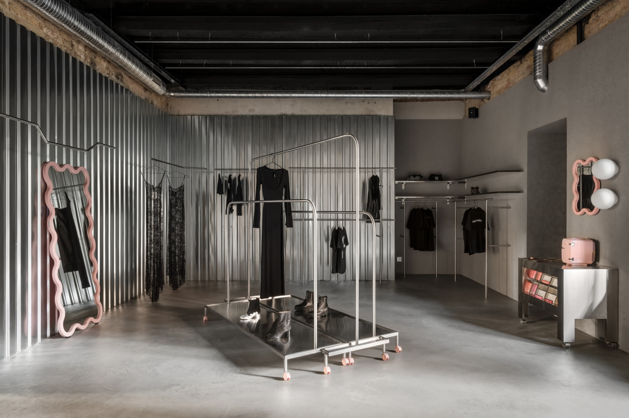 The space was designed by TEMP Project studio, which also created designs for Anoeses and Gunia Project stores. According to architect Anastasiia Tempinska, the owners of Storage X Domaine 17 wanted to convey the atmosphere of an ‘abandoned industrial zone’ with scratched concrete surfaces, exposed rebar, and plants.