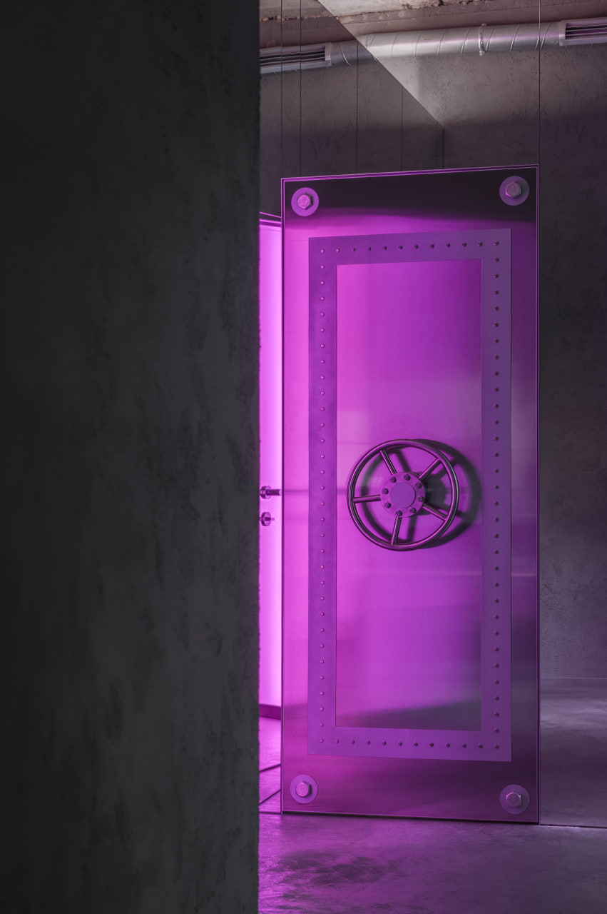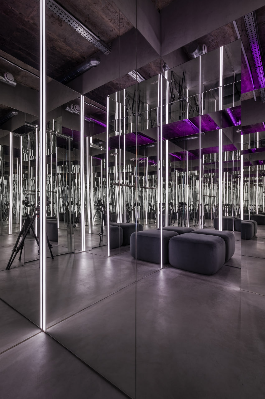 The third hall, located at the back of the space, houses the fitting rooms. It is decorated with mirrored walls that create a maze-like effect. The storage room is separated from the main area by heavy doors designed to resemble a safe.