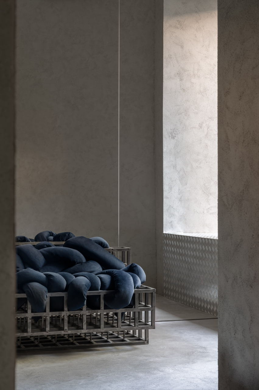 ‘Brick, exposed beams and poured concrete interact with steel vault doors, mirrors and digital chaos. The result is a place where urban grit, visual storytelling and cultural memory collide — a dystopian backdrop for fashion, art and identity,’ the project description on Dezeen’s website reads.