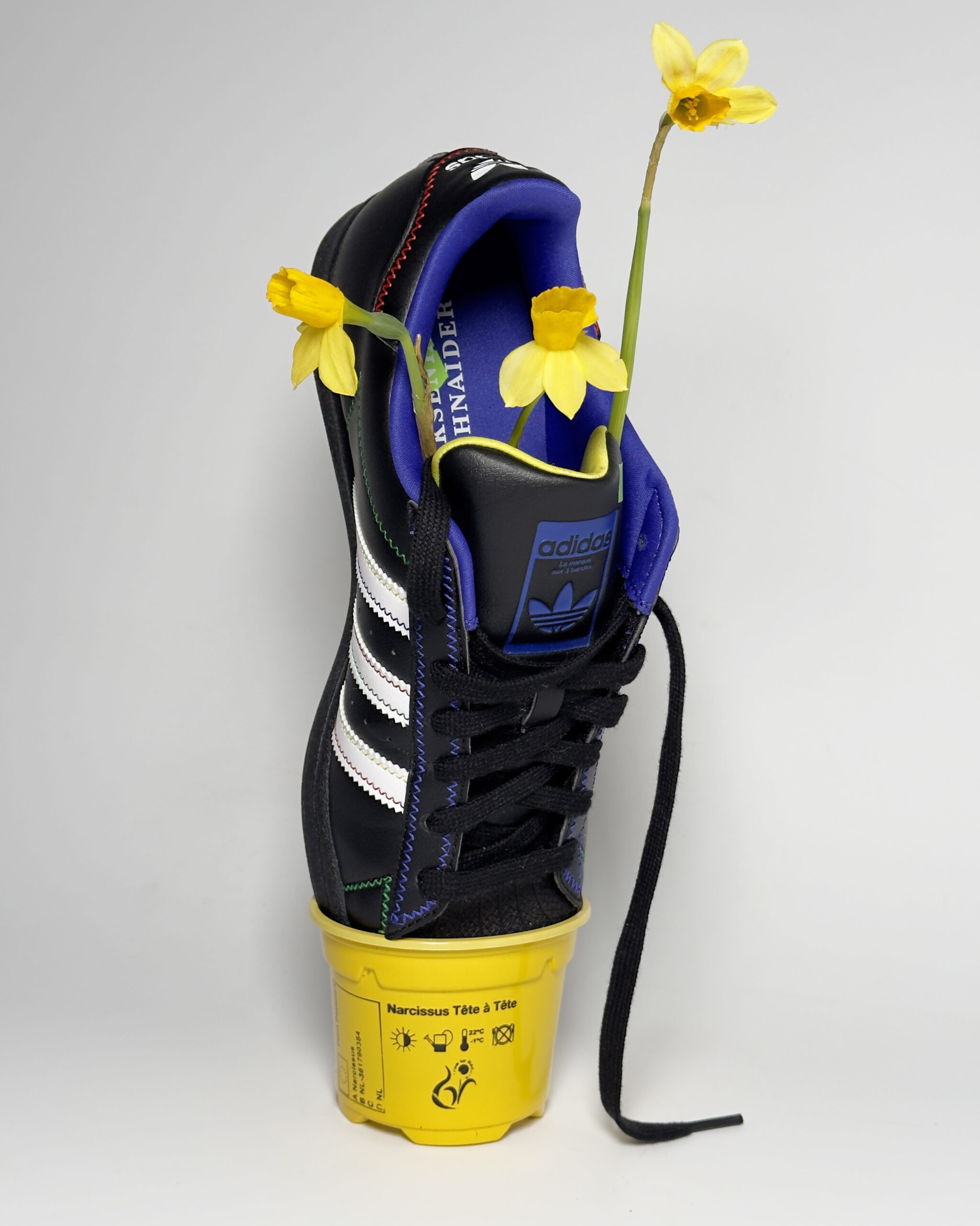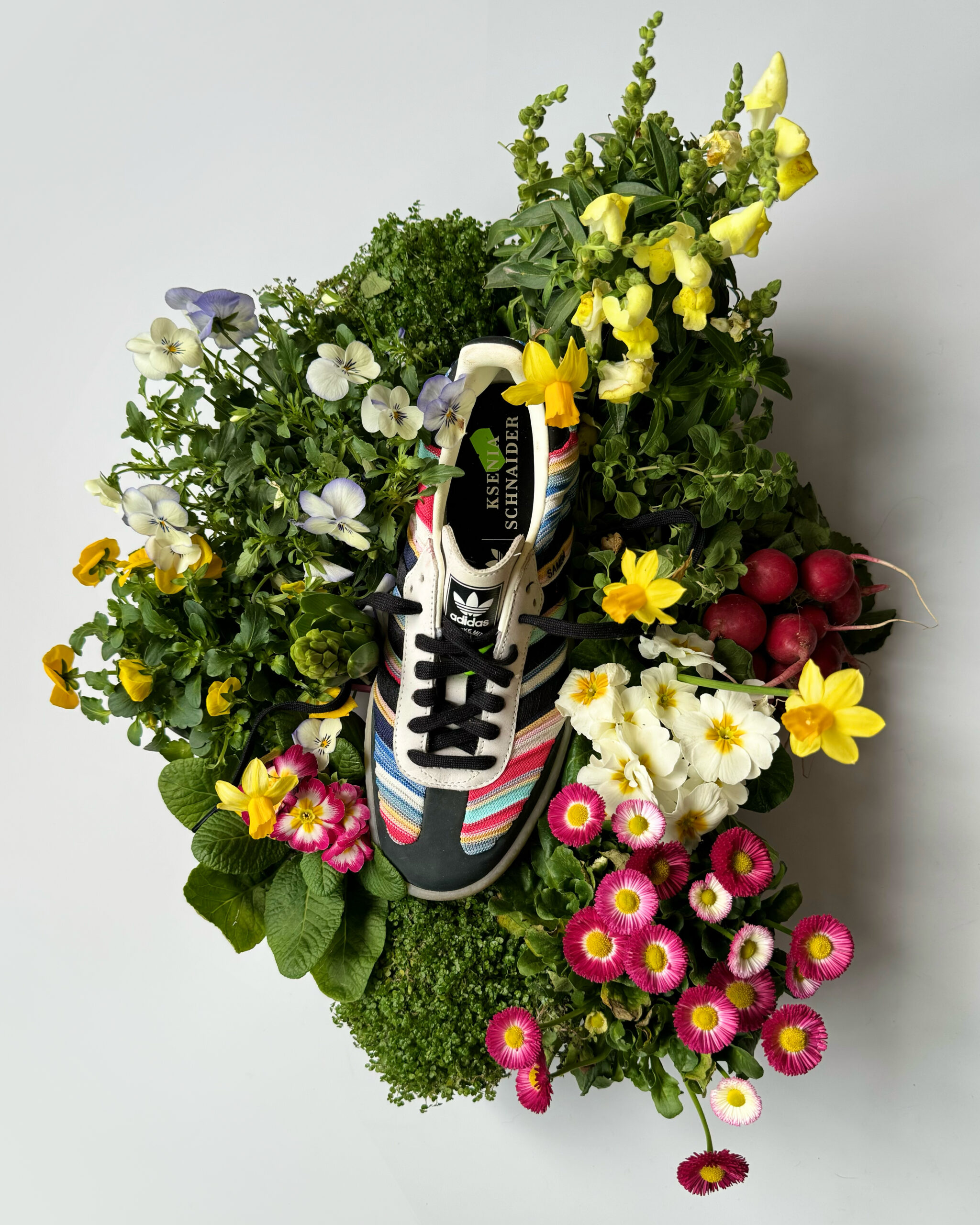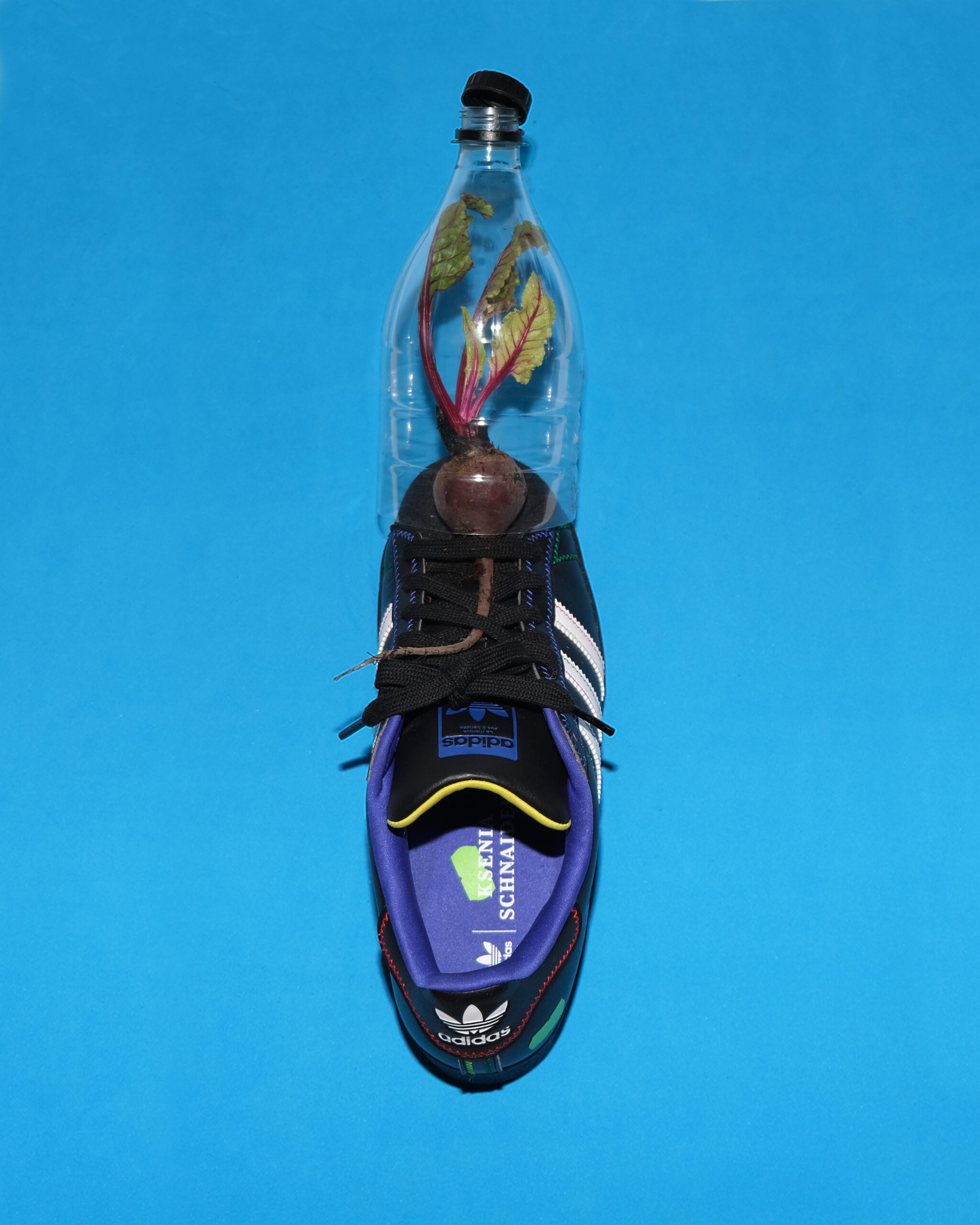 KSENIASCHNAIDER and adidas Originals presented a collaborative campaign for the Superstar and Samba sneakers from the brands’ second collection, released in early March. For the campaign, Ukrainian creator Liza Litovka (Floweirdy) made compositions using flowers, vegetables and plastics