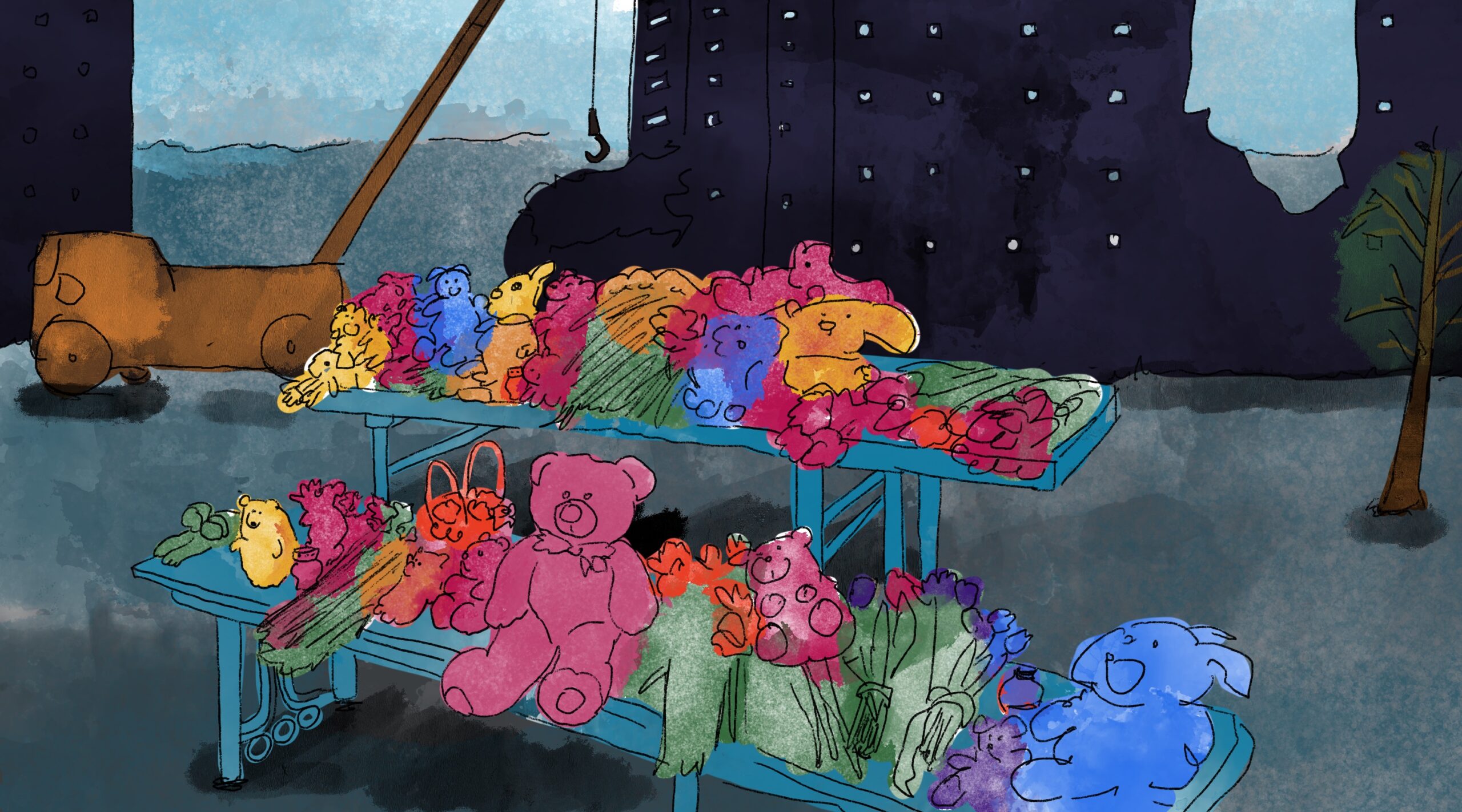 У квітні 2025 року російська армія обстріляла Київ, і після влучання ракет у Святошинському районі загинуло 12 людей. До фасаду зруйнованого двоповерхового будинку принесли квіти урядова делегація, на чолі з президентом України, але з іншого боку будинку люди також покладали квіти та іграшки, які прибрали максимум через п’ять днів після атаки. Імовірно, це сталося внаслідок робіт з усунення наслідків атаки. Щоб дізнатися, чи задіяні служби районної адміністрації у прибиранні, DTF Magazine надіслав запит до КМДА.