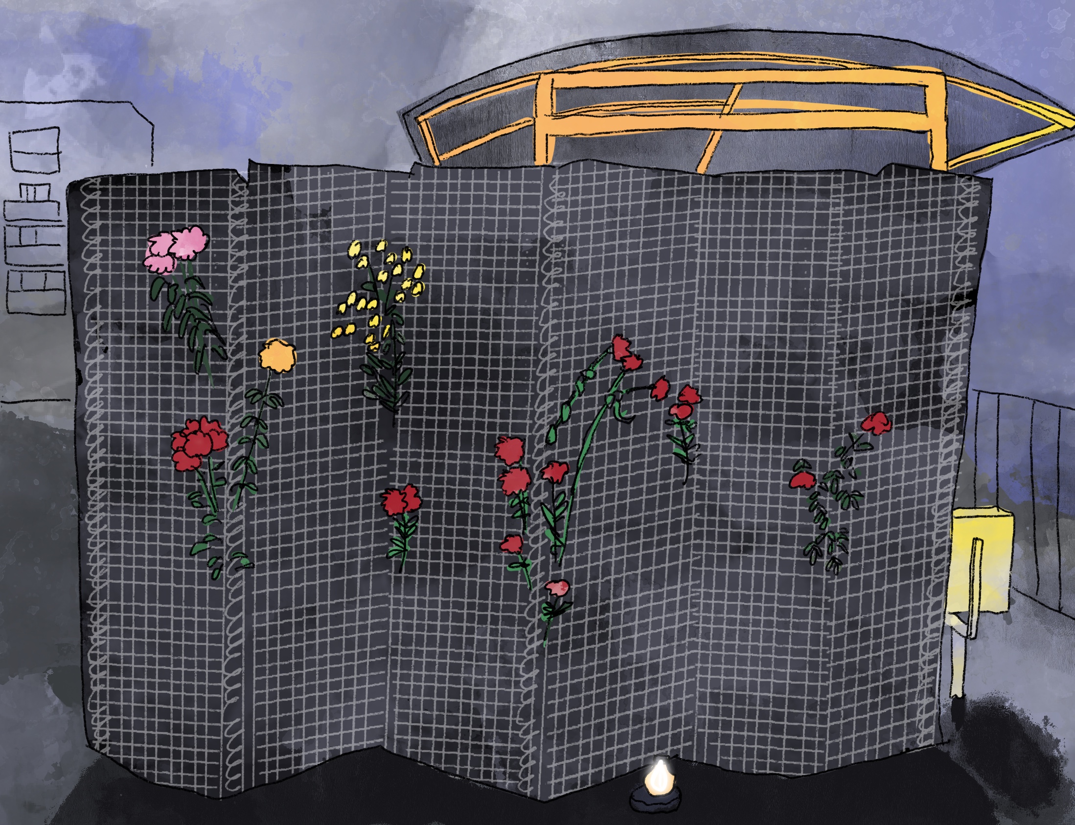 З боку газону зберігається тиша. Люди приходять вшанувати пам’ять побратимів і посестер, хтось доглядає за портретами і поправляє їх, сидить на газоні поруч з портретом і погладжує його, інший — попереджає дитину, щоб не ходила по цьому газону, «бо це ж пам’ять». Між ними — сходи з інсталяцією «Я люблю Україну» і десятки лампадок.