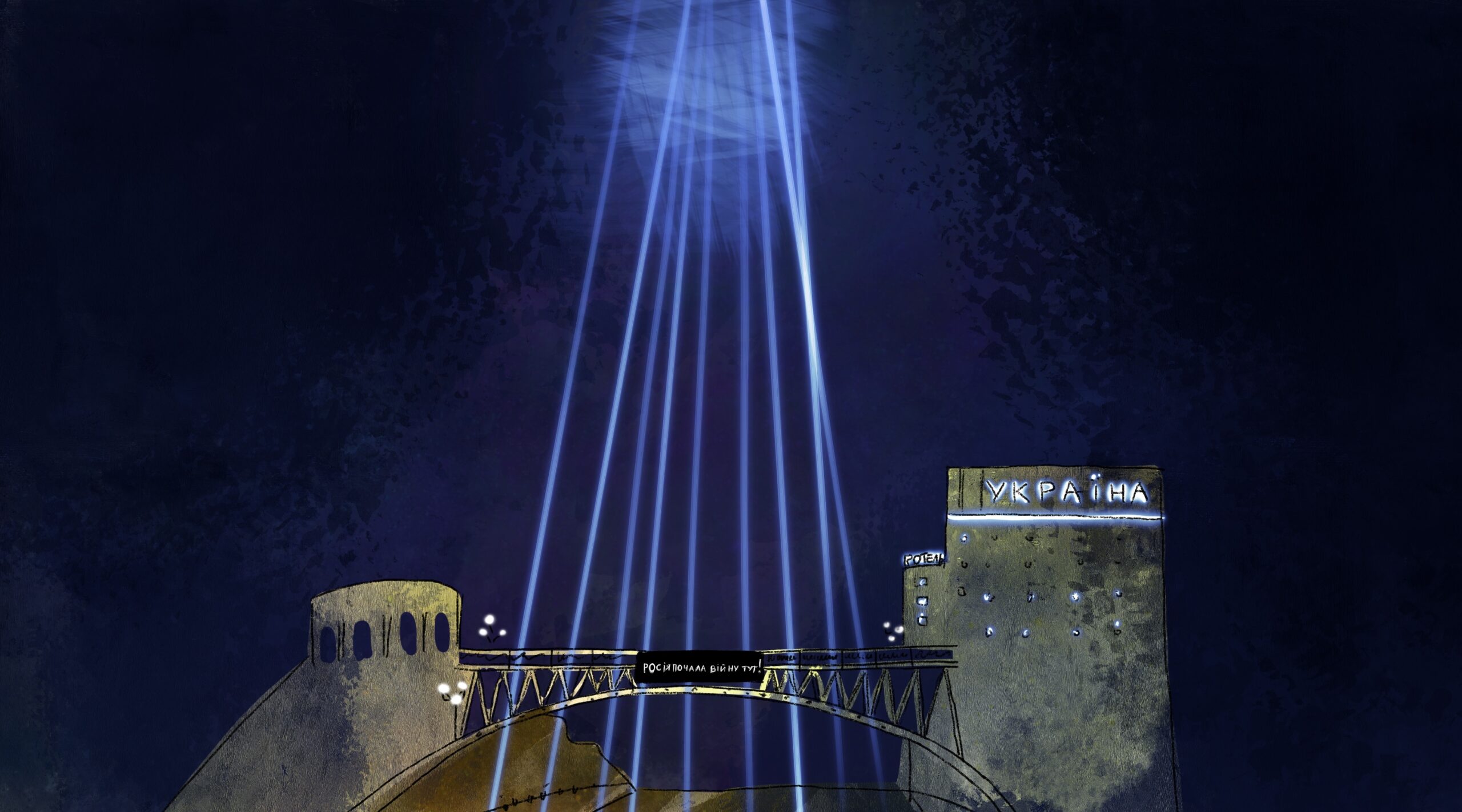 Через Хрещатик — перехід, де продають лампадки, прапори і жовто-блакитні букети. З дальнього боку майдану лунають українські пісні в акустичному виконанні, гучно спілкуються підлітки, ходять ростові ляльки, зокрема і пес Патрон.