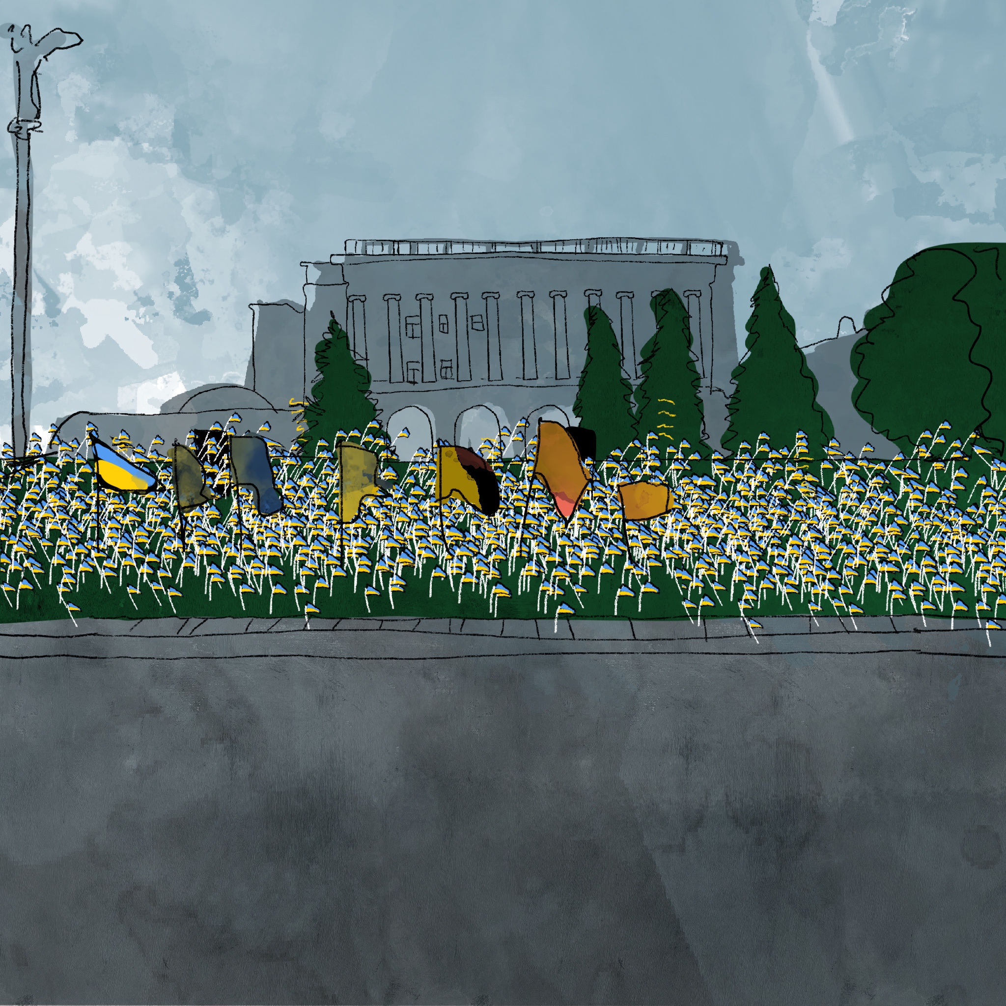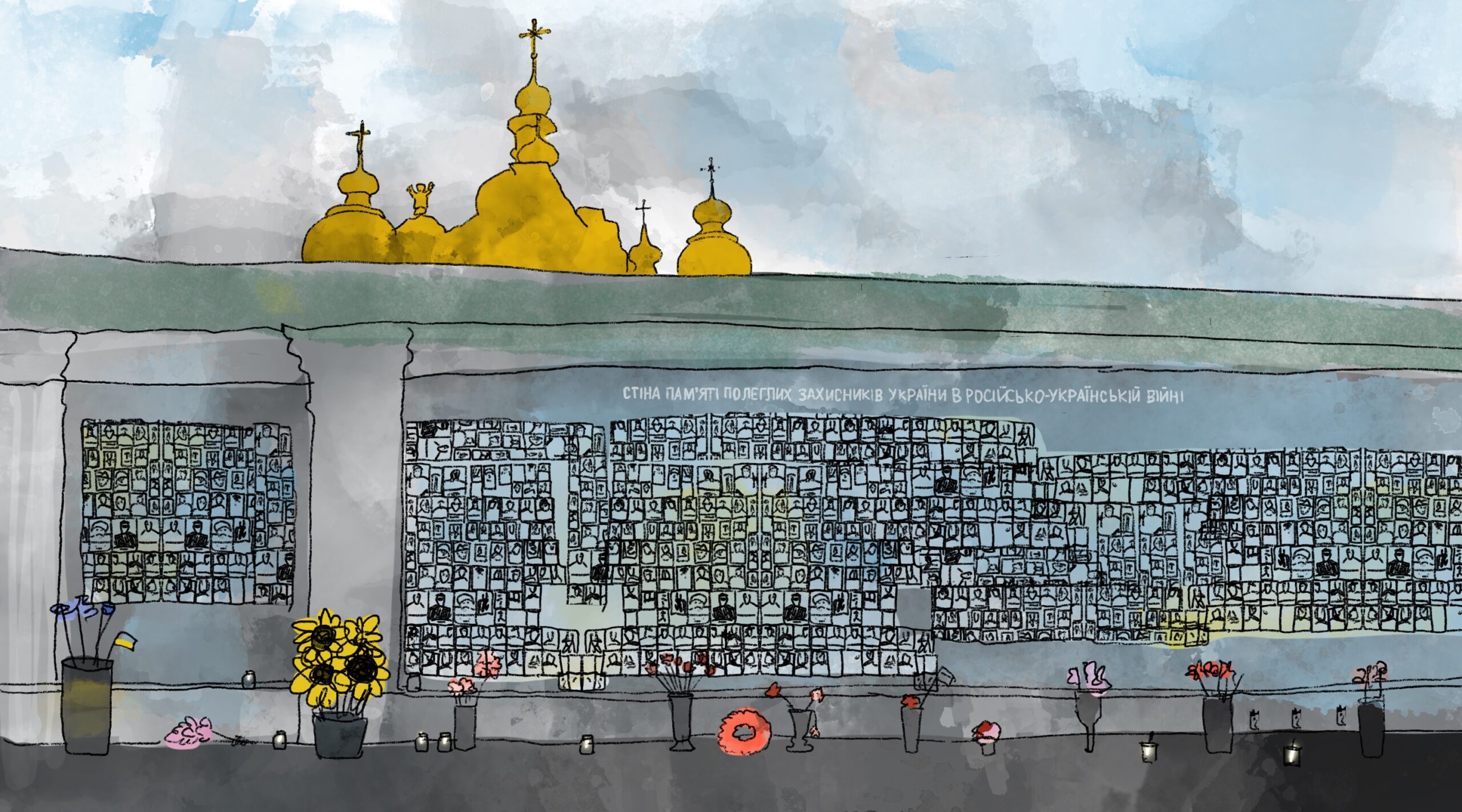 Найвідоміший і наймасштабніший стихійний меморіал, створеним під час війни Росії проти України, — прапорці на майдані Незалежності, але все почалося у 2014 році вище, на Інститутській.