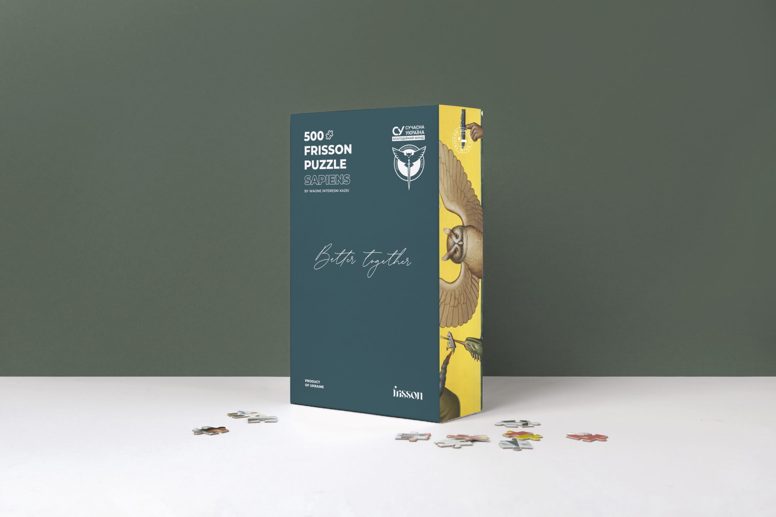 Бренд Frisson спільно з Володимиром Waone Манжосом випустили лімітовану колекцію благодійних наборів пазлів SAPIENS. В його основі — київський мурал Waone, створений у жовтні у співпраці з Головним управлінням розвідки Міноборони України