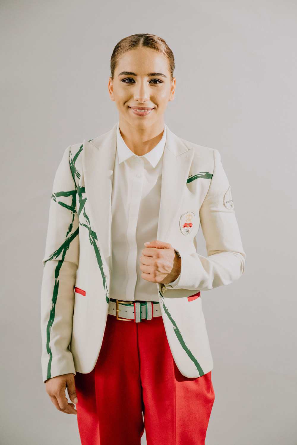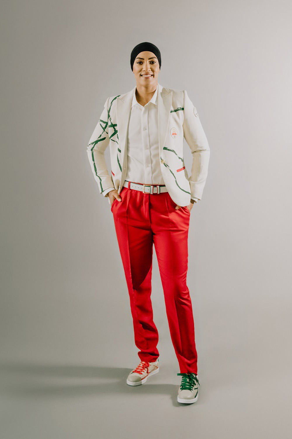 Дизайн форми від Ali Drissi для церемонії відкриття складається з бежевого піджака, прикрашеного тонкою зеленою зіркою, червоних штанів, золотих ґудзиків і різноколірних деталей.