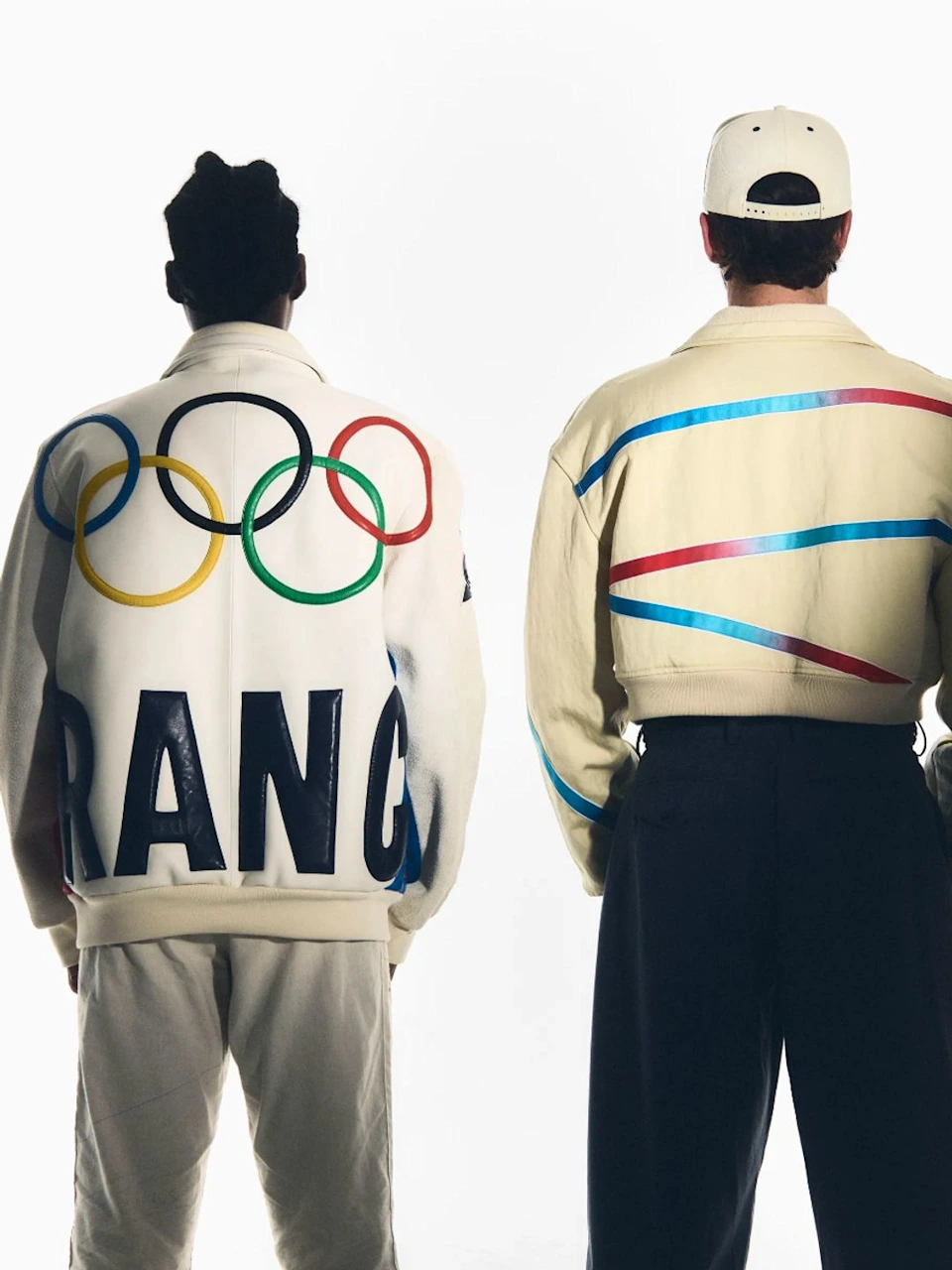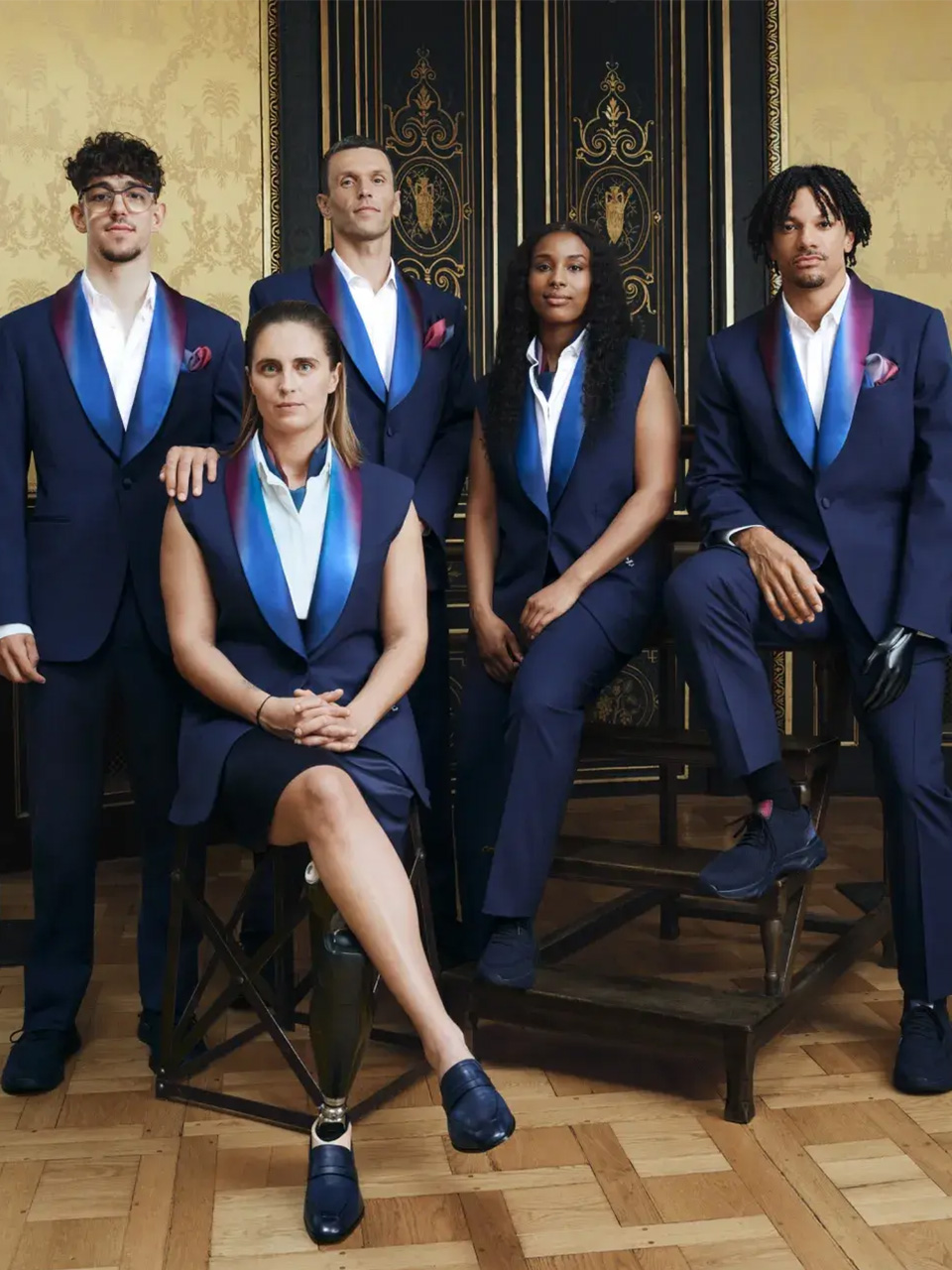 Форму французької команди — темно-синій костюм і білу сорочку — розробила колишня редакторка Vogue France і засновниця CR Fashion Book Карін Ройтфельд у співпраці з фешен-конгломератом LVMH. Класичні костюми з піджаків і жилетів з градієнтним принтом прапора на лацканах та штанів пошив на замовлення бренд Berluti. Щоб забезпечити комфорт і правильну посадку для спортсменів, дім моди виготовив взуття та одяг у різних розмірах — від 3XS до 6XL.