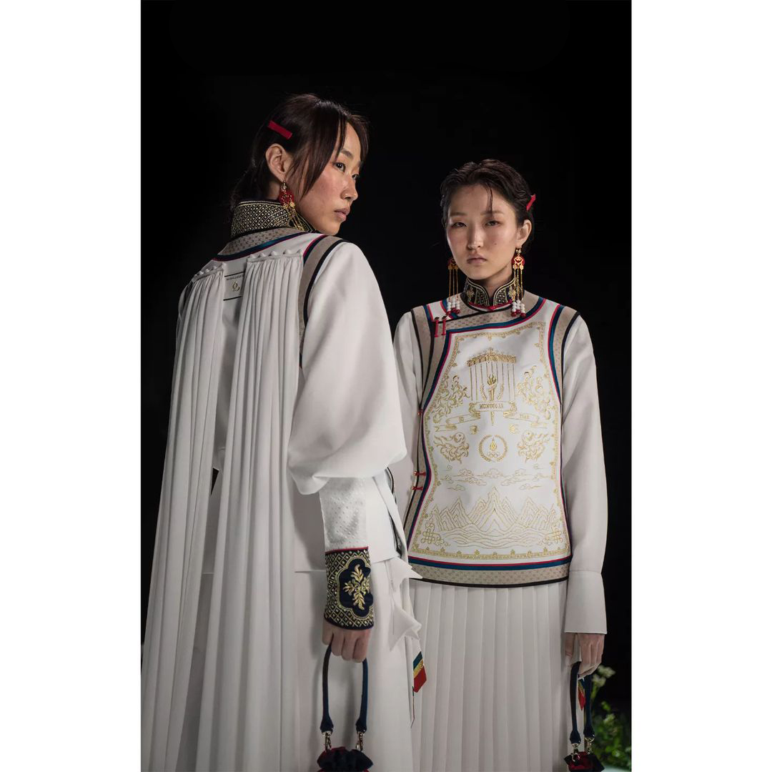 У жіночих образах сукня на затин або спідниця та сорочка поєднуються з вишитою білою жилеткою, білими туфлями й сумочкою і доповнюються сережками з традиційними мотивами. В усіх образах використовуються національні кольори Монголії — синій, червоний і білий.