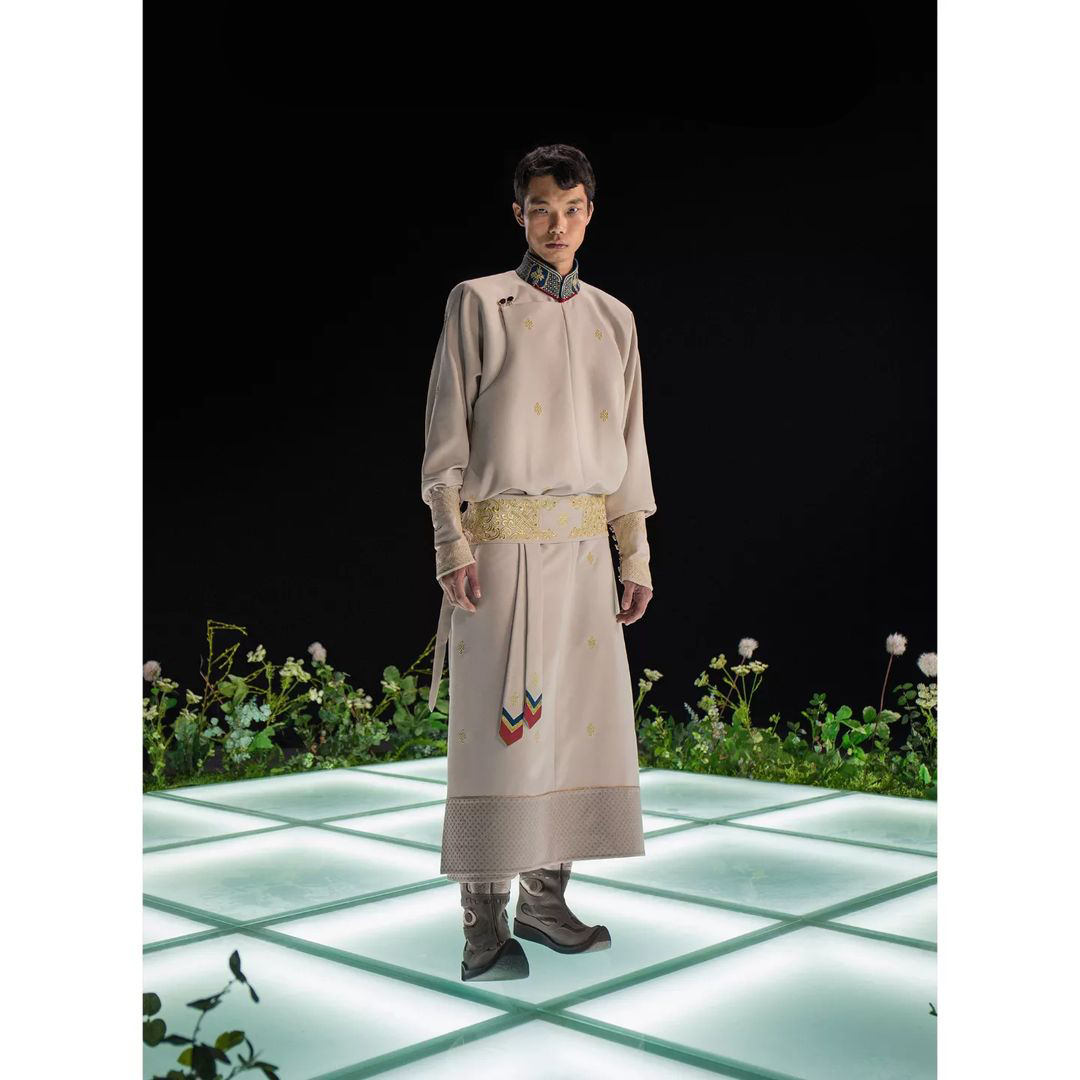 Цього разу сестри-дизайнерки створили три образи, взявши за основу традиційне монгольське вбрання. Чоловічий образ складається з синього розшитого жилета, довгої сорочки деел, капелюха малгая, черевиків гутал і пояса.