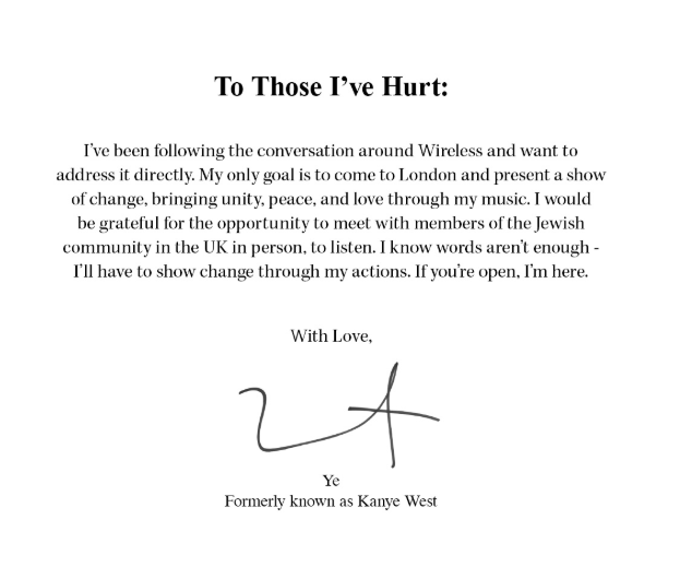 Свій стейтмент репер опублікував як доповнення до колонки у The Wall Street Journal. Вест наголошує, що розуміє, «що слів недостатньо», і хоче довести зміни діями, тож запропонував зустріч із представниками єврейської спільноти у Великій Британії, «щоб вислухати їх».