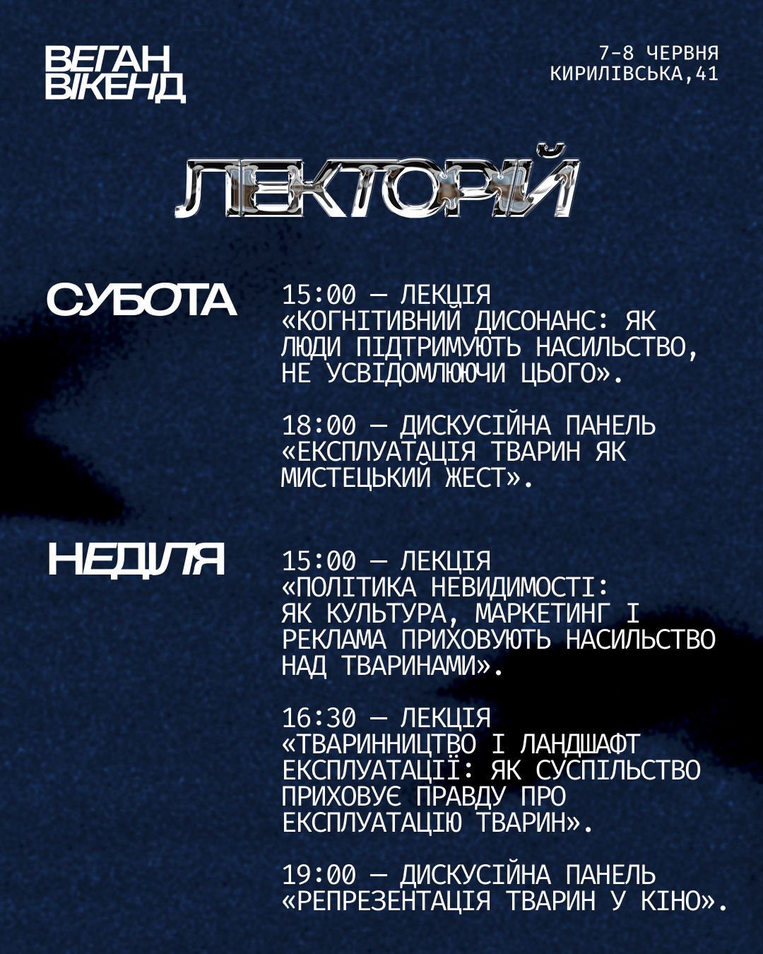 У межах освітньої частини Веган Вікенд Х підійматимуть етичні, культурні та соціальні теми: від використання тваринних матеріалів у мистецьких практиках до репрезентації тварин у мистецтві та кіно, від культури замовчування насильства до дослідження маркетингових механізмів, що його приховують.