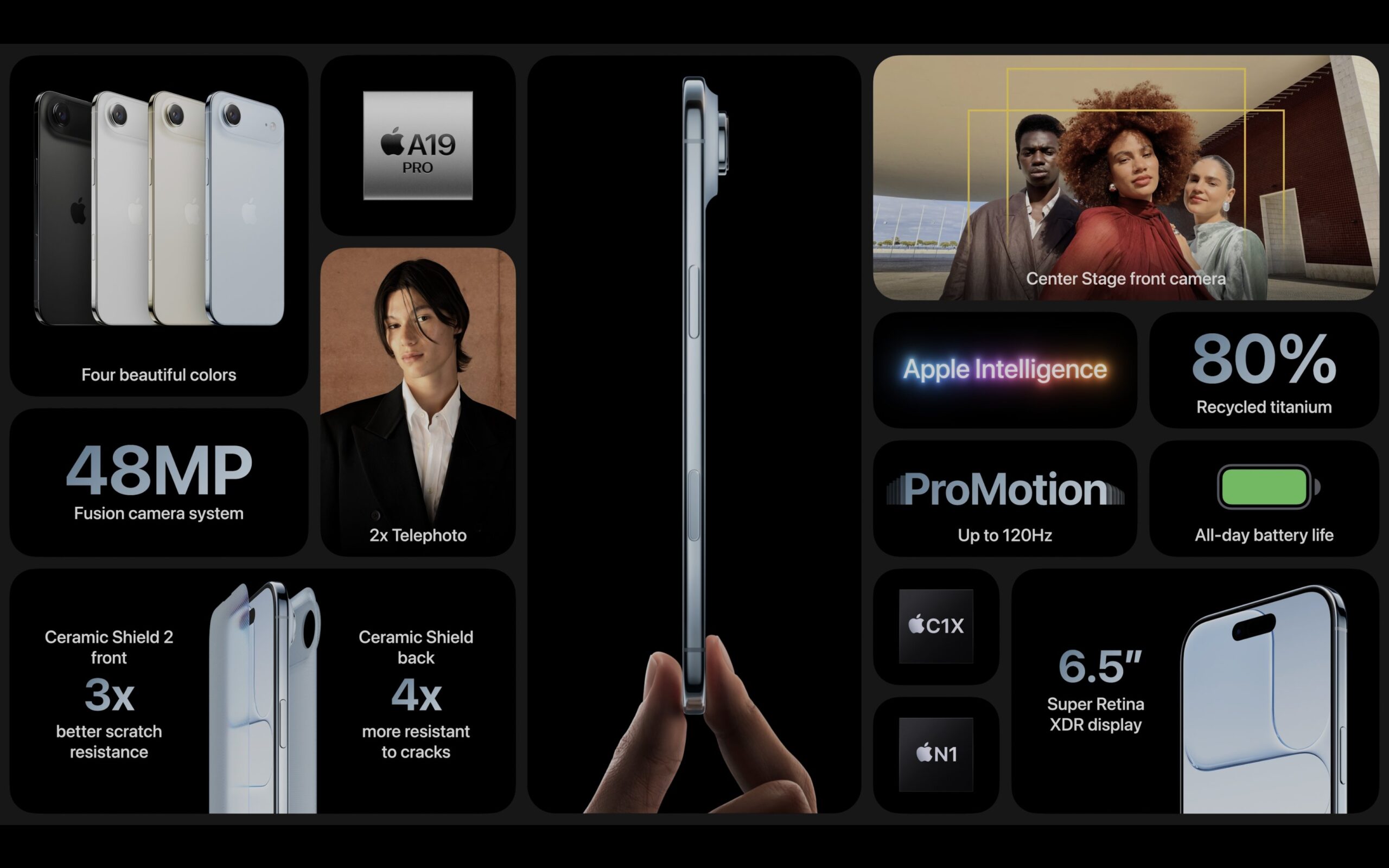 — Оновлена базова модель iPhone отримала збільшений екран (6,3 дюйма порівняно з 6,1 дюйма в iPhone 16) з частотою оновлення 120 Герц та керамічним захистом скла Ceramic Shield другого покоління.