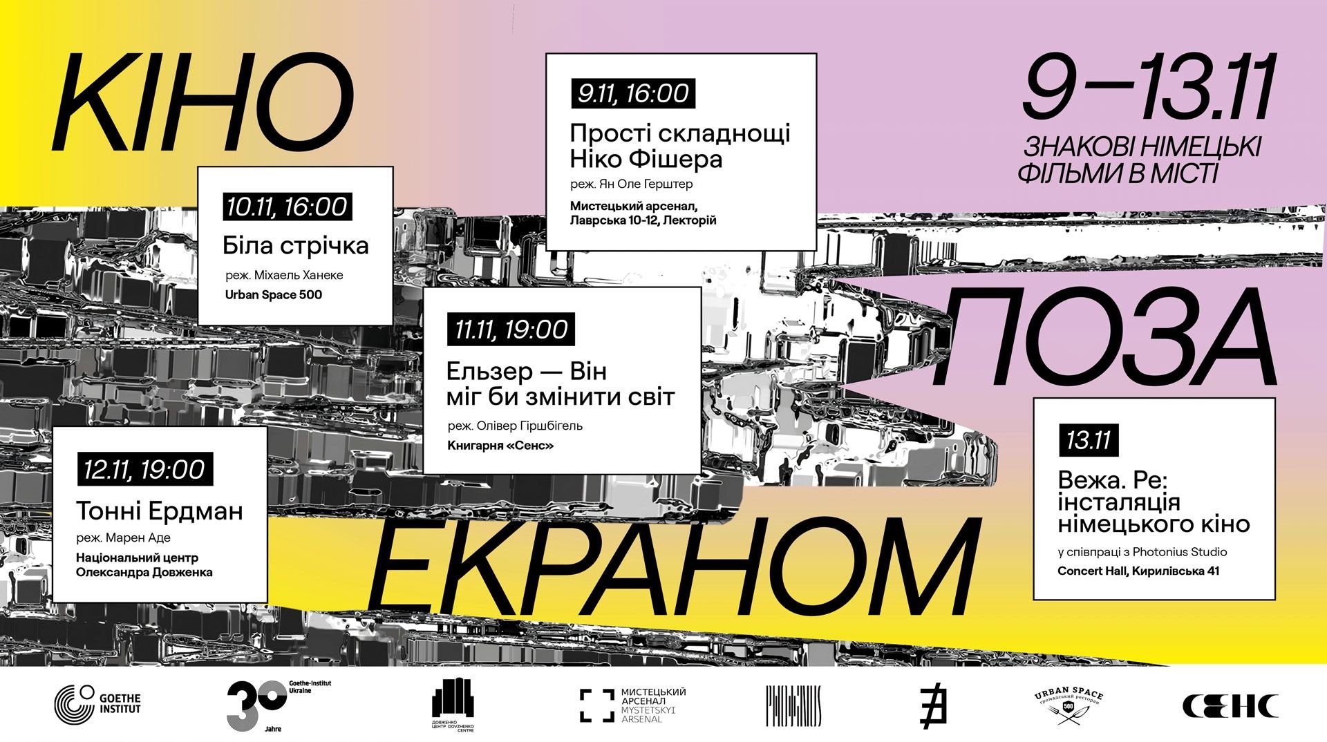 Із 9 до 13 листопада Goethe-Institut на честь свого 30-річчя організує серію подій «Кіно поза екраном: знакові німецькі фільми у місті» — чотири кінопокази німецьких фільмів у різних публічних просторах Києва, а також спеціальний івент, у якому кіно поєднається з електронною музикою.
