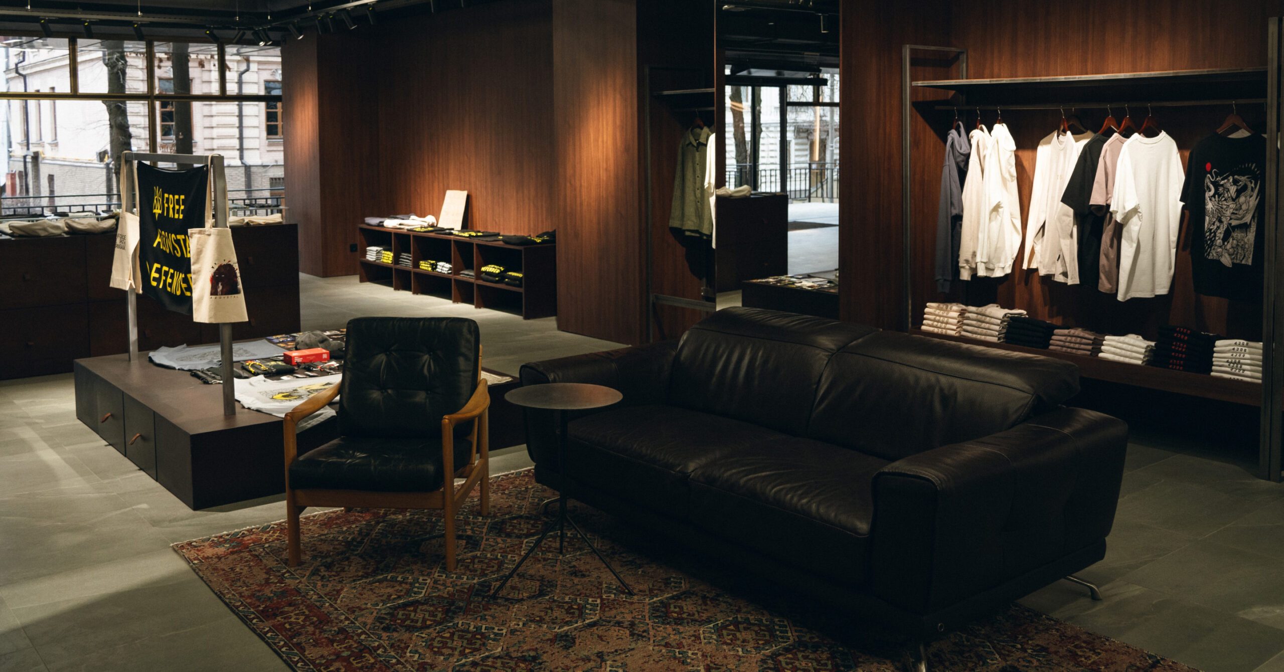 У львівському просторі представлено бренд 4308 і мерч Free Azovstal Defenders. Також окремо працює шоурум RIOTDIVISION — його асортимент частково відрізнятиметься від представленого в Києві. Теквер-бренд також планує додавати локальні позиції: тематичні принти та спеціальні дропи, повʼязані з містом, а також колаборації з локальними героями.