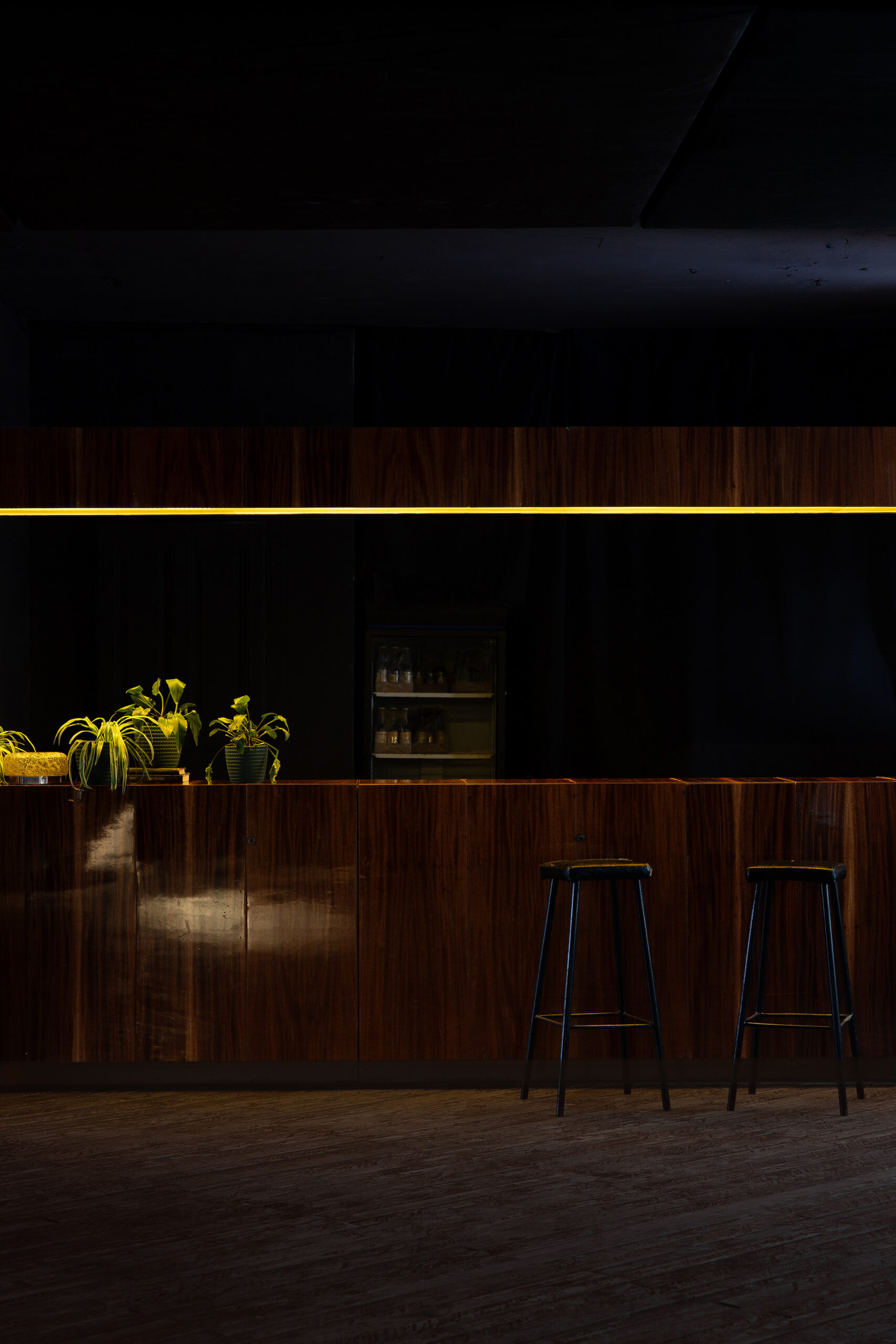 П’ятиметрову барну стійку зібрали зі старих шаф, поверхня яких вкрита стійким до вологи поліефірним лаком — на деяких панелях можна побачити старі замки та фурнітуру.