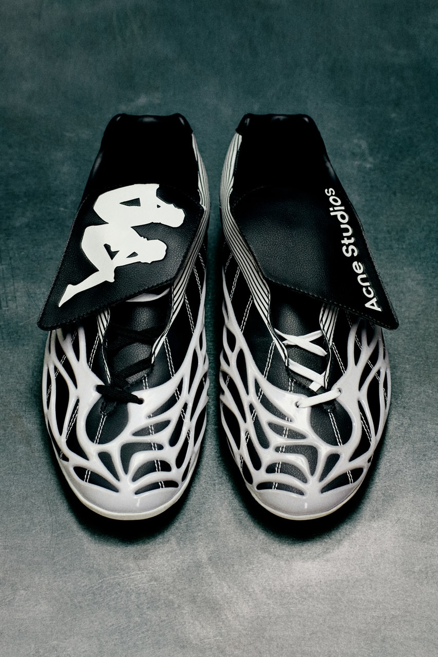 Частиною колекції стала і спільна модель кросівок, силует якої відсилає до футбольних бутсів. Шкіряну основу пари доповнили акцентним кейджем білого кольору та асиметричною накладкою над шнурівкою з логотипами Kappa та Acne Studios.