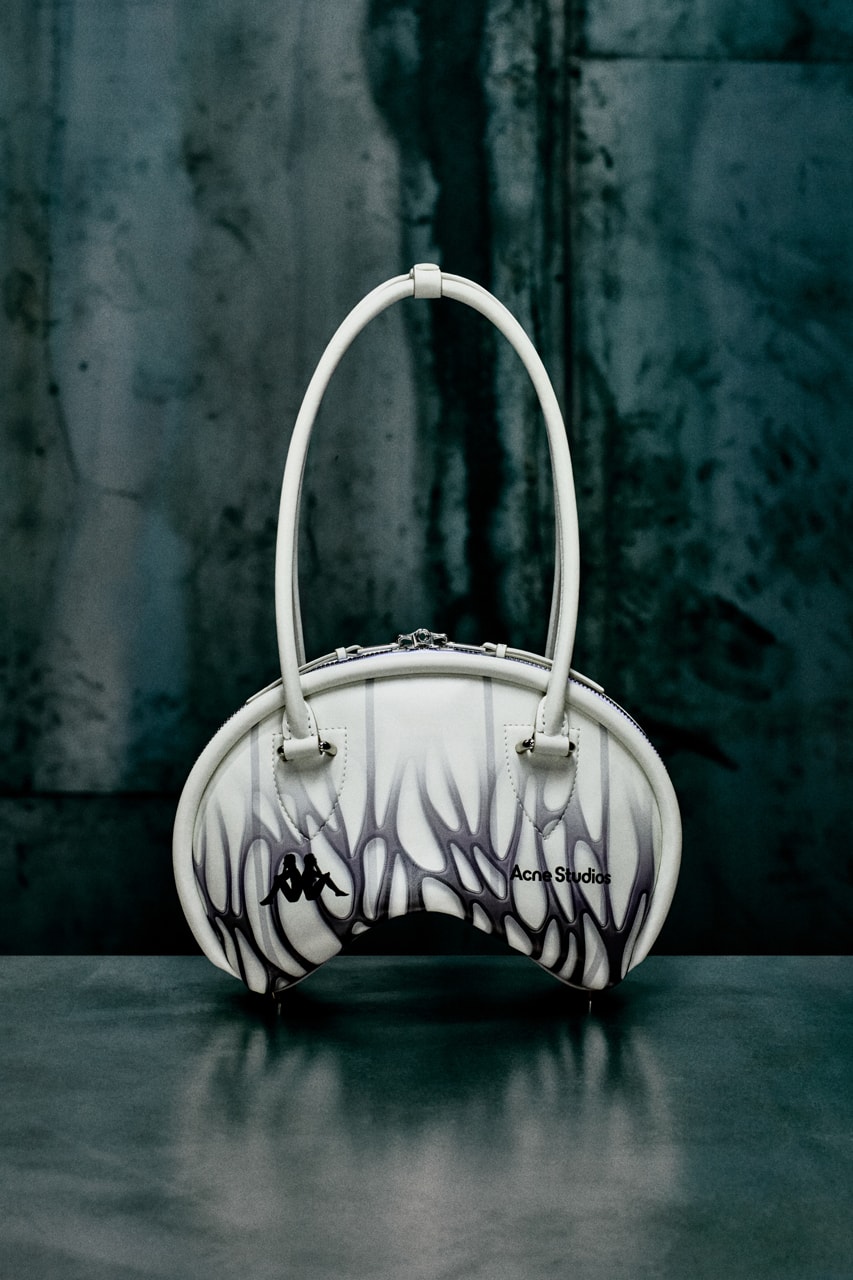 Аксесуари представлені кепками з вишитим кобрендингом, високими футбольними гетрами та формованими шкіряними сумками Acne Studios Bowlina bag з колекції Весна/Літо 2025, доповненими тим самим вогняним візерунком.