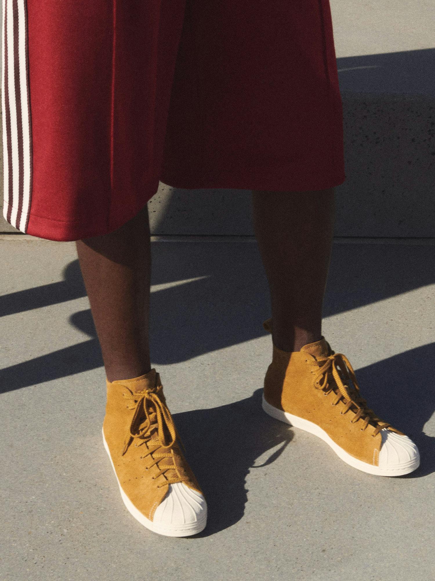 У межах колаборації бренди представили ще один взуттєвий силует — нову версію високих кедів adidas Superstar Hi. М’яка замшева пара отримала фірмовий носок-ракушку, а також потоншену підошву та перфорований логотип з трьома смугами збоку.