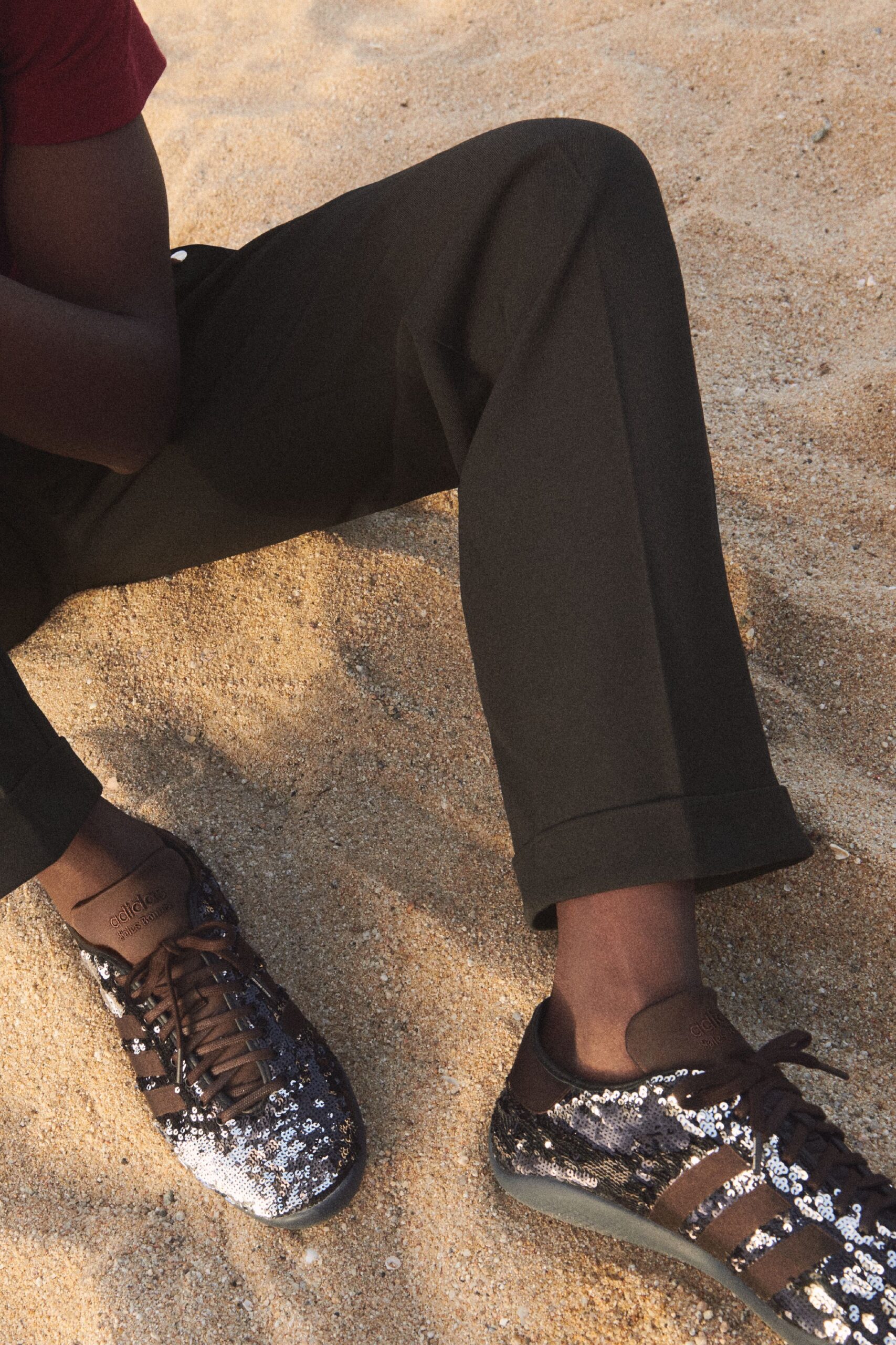 Низька пара отримала замшеву основу та тонку підошву з ромбоподібним візерунком. Візуально кросівки майже повністю дублюють бігову модель adidas Tokyo, представлену у 1973 році та перевипущену в оновленому форматі у 2025 році. До adidas Samba відсилає передня частина кросівка