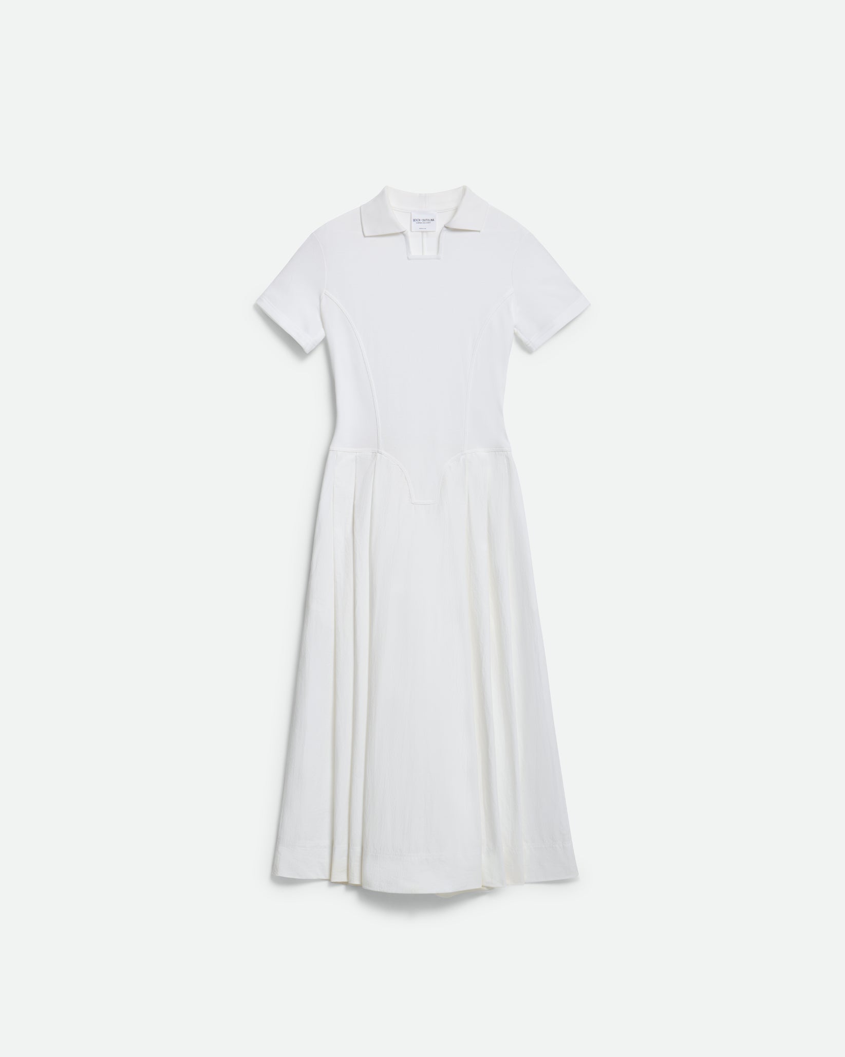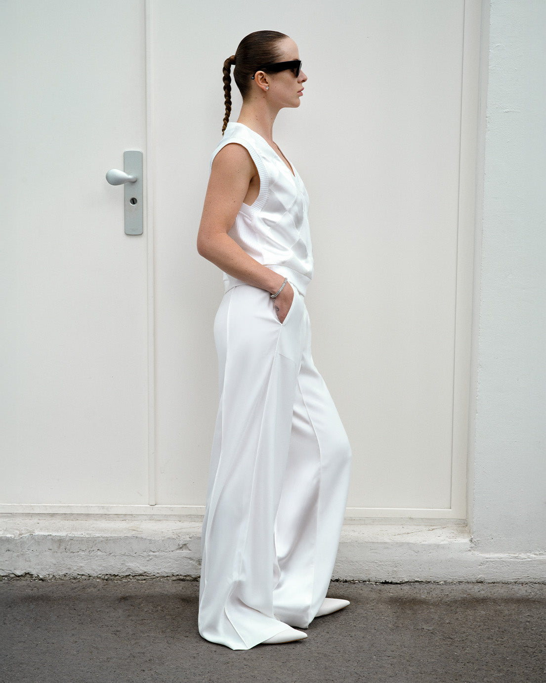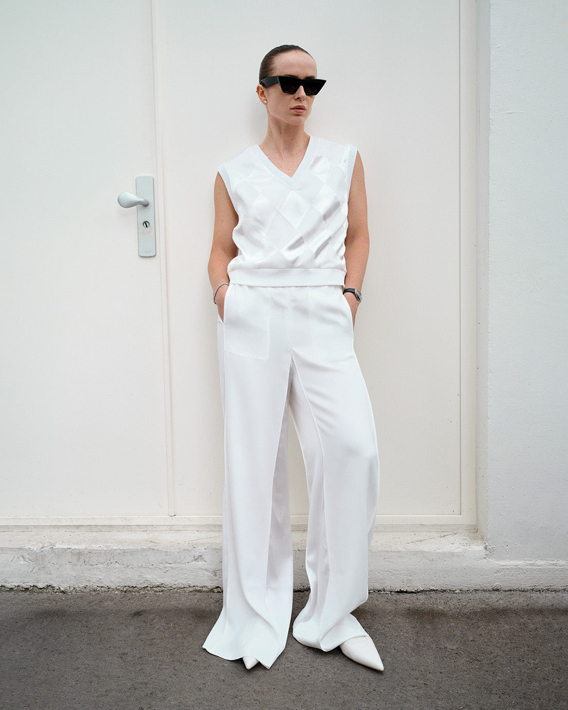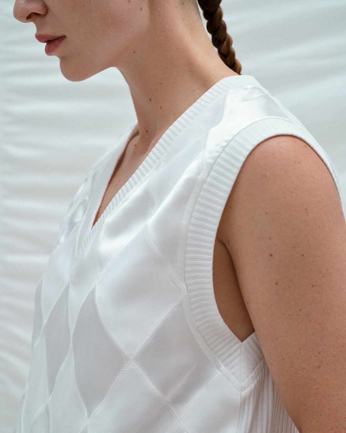 Капсула складається з довгої силуетної сукні, натхненної тенісними футболками-поло, жилети ручної роботи з ромбоподібним візерунком, створеним із залишків тканини, а також довгі базові штани із завищеною талією.