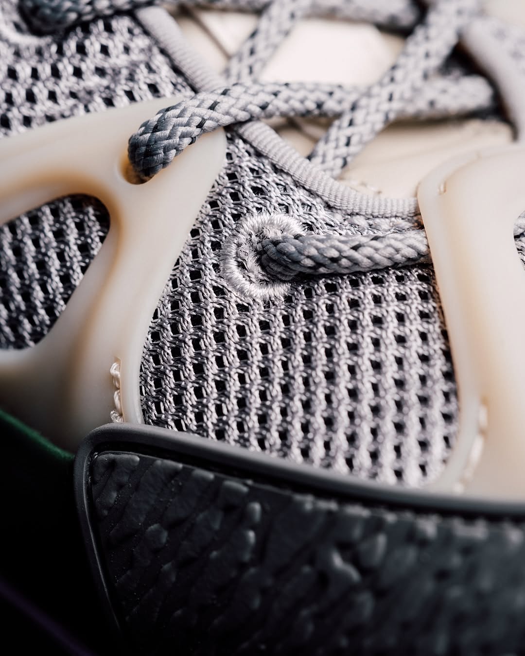 Верх кросівок Trailgrip Amoeba виконали з формованої повітропроникної сітки з мембраною GORE-TEX та доповнили гумовими накладками, одна з яких дублює контур силуету кросівка, а інша — формує кейдж довкола основи. Окремими текстурованими гумовими елементами посилили носок та зону п’яти.