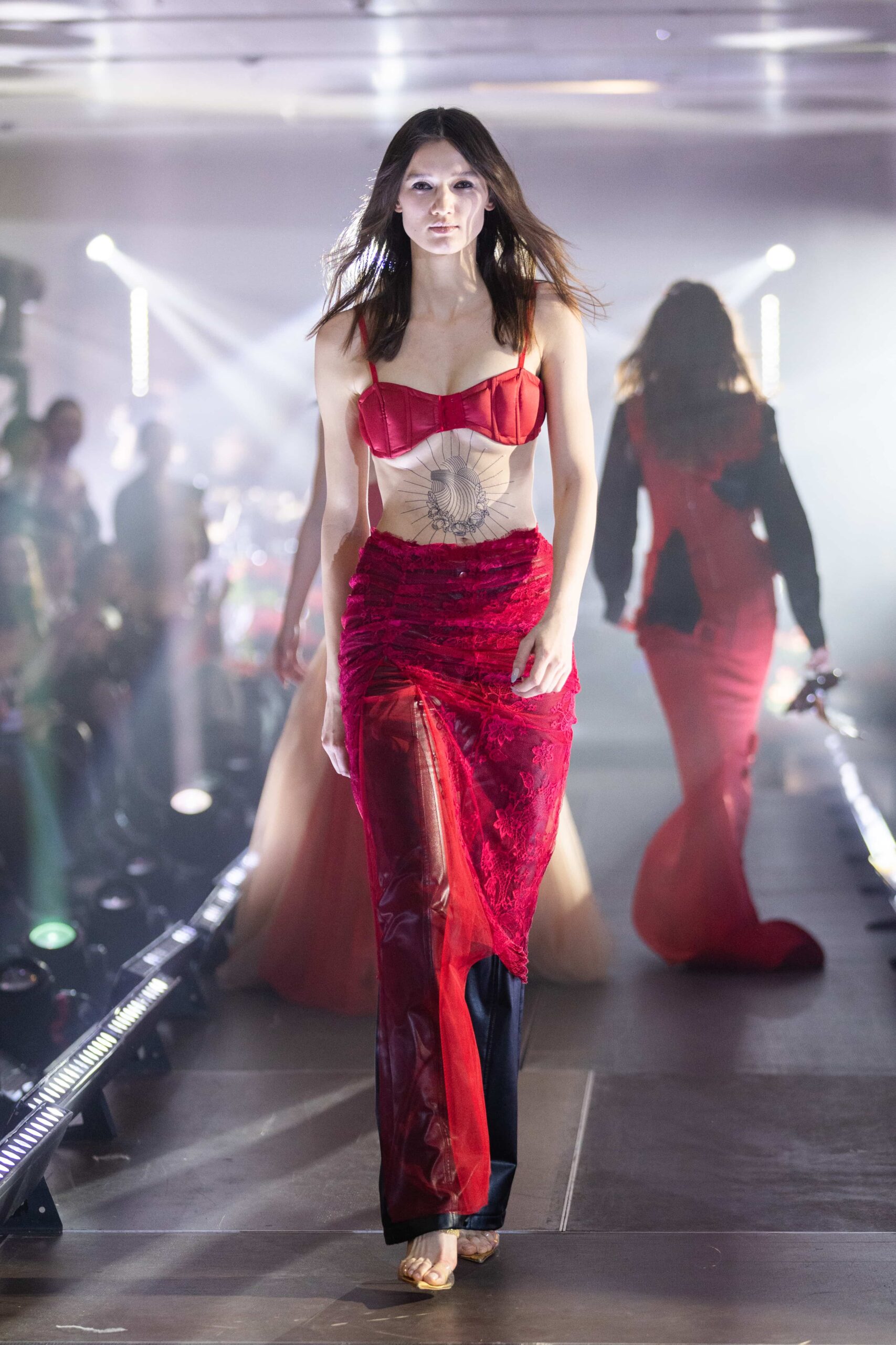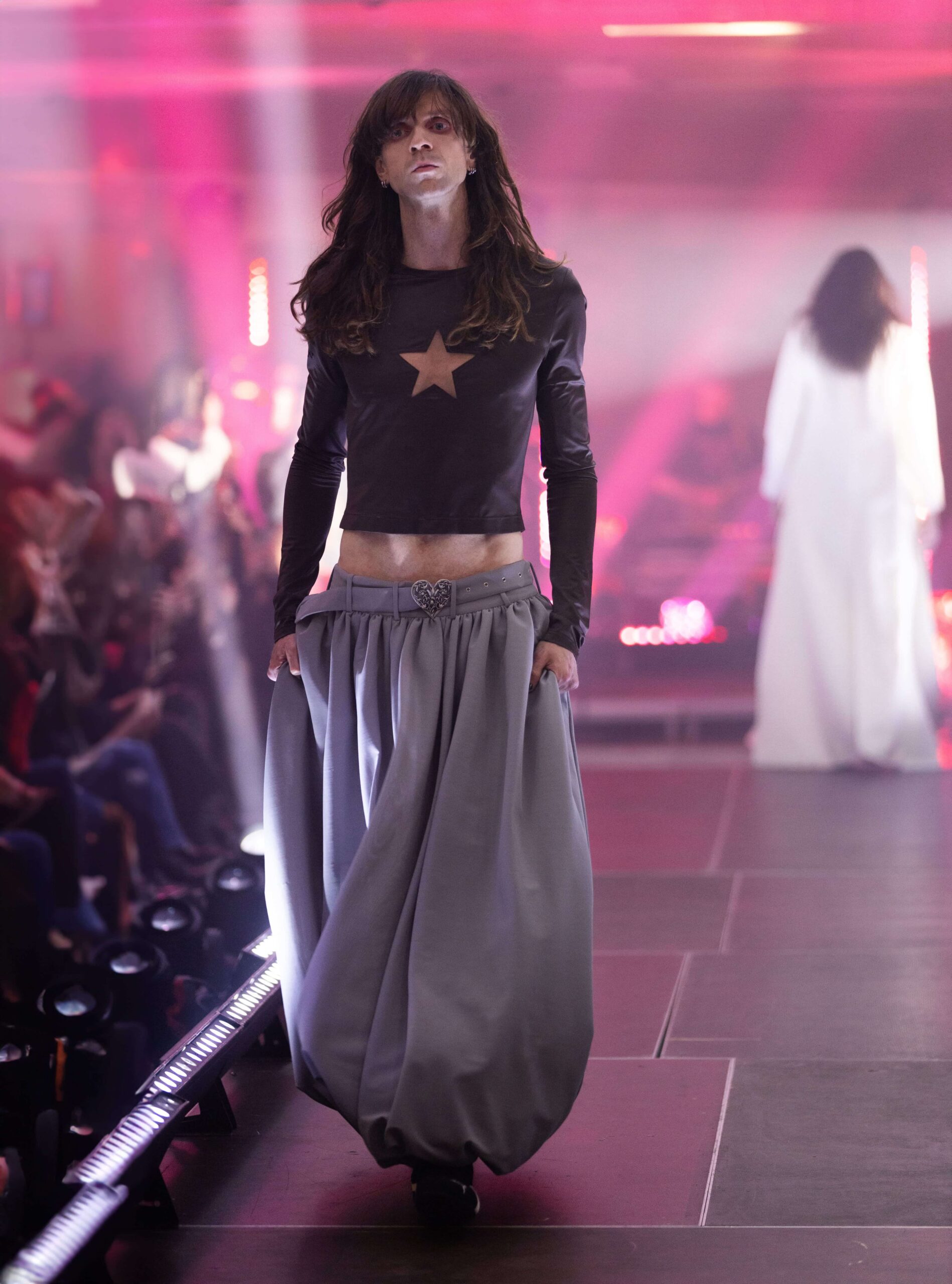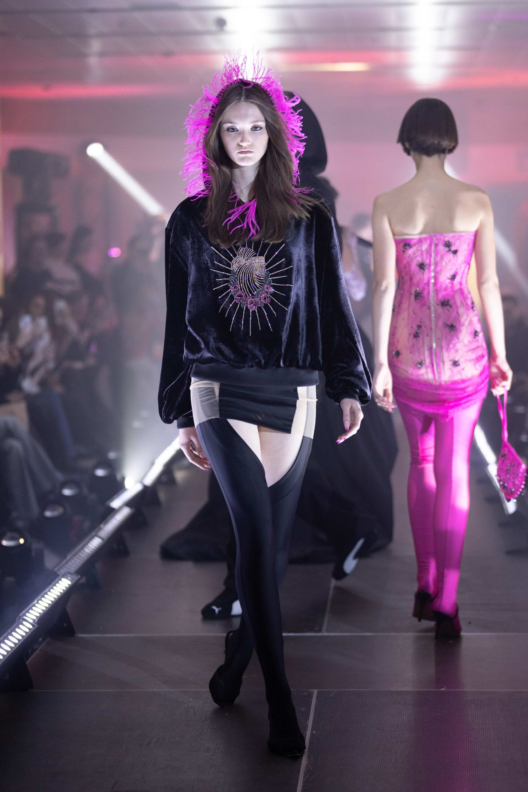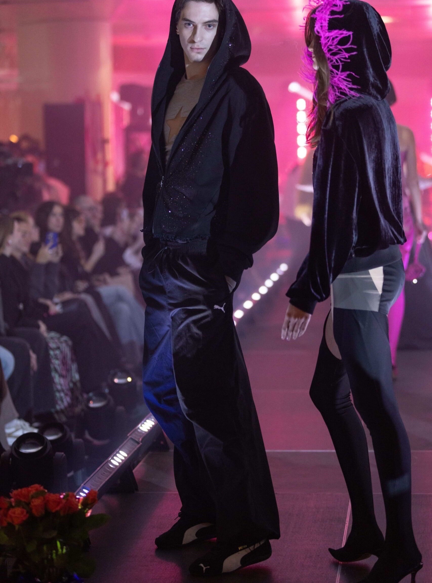 Речами PUMA також доповнили кежуал-образи моделей: модель у зіп-худі, всіяному стразами, також одягли у спортивні штани та кросівки, а одним з елементів образу із сірого лонгсліва із вирізом-зіркою та спідниці-парашута став один із флагманських силуетів кросівок PUMA Speeedcat.