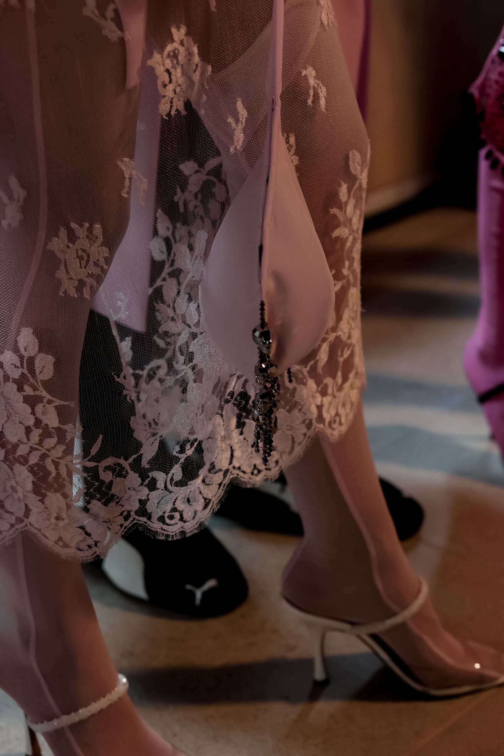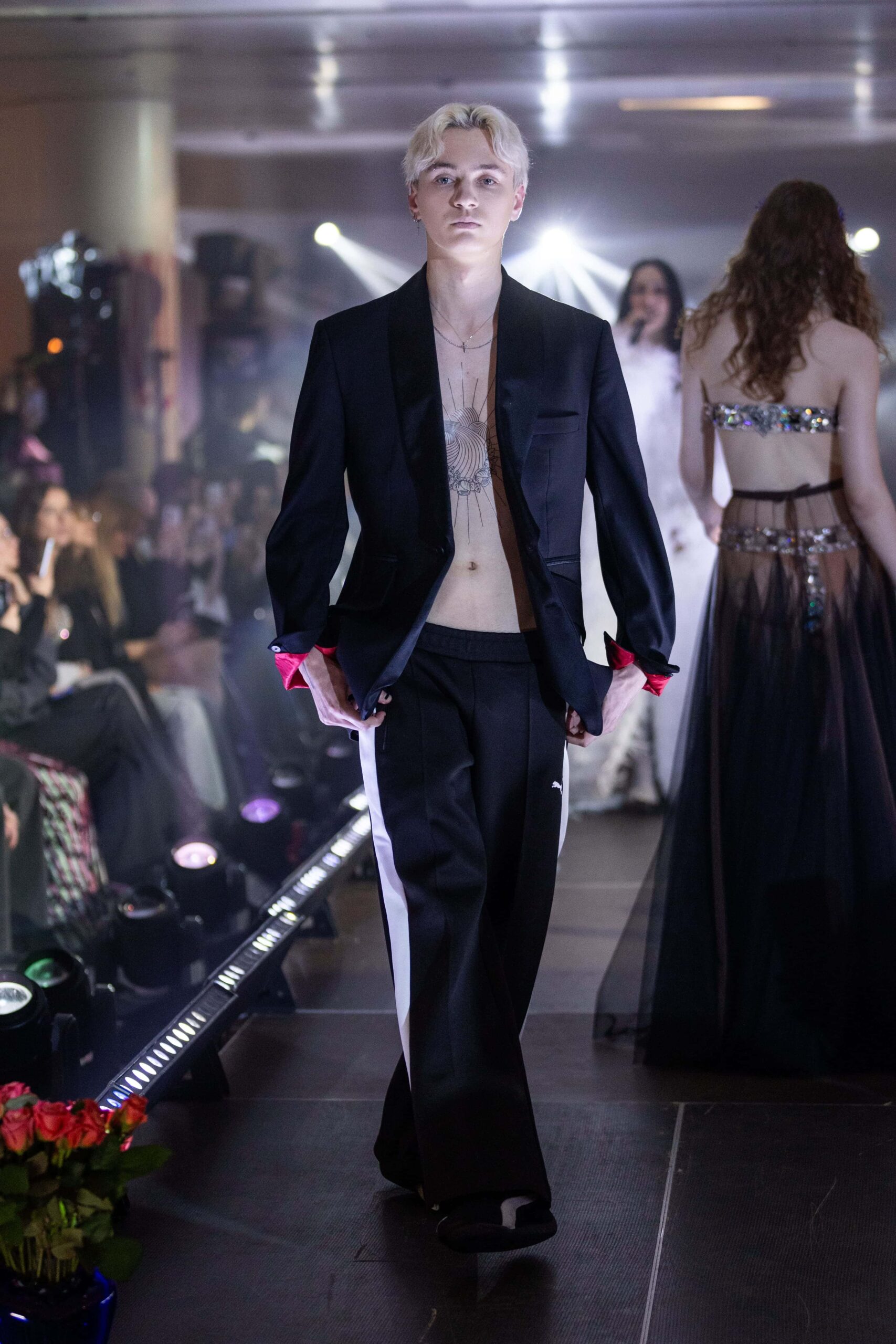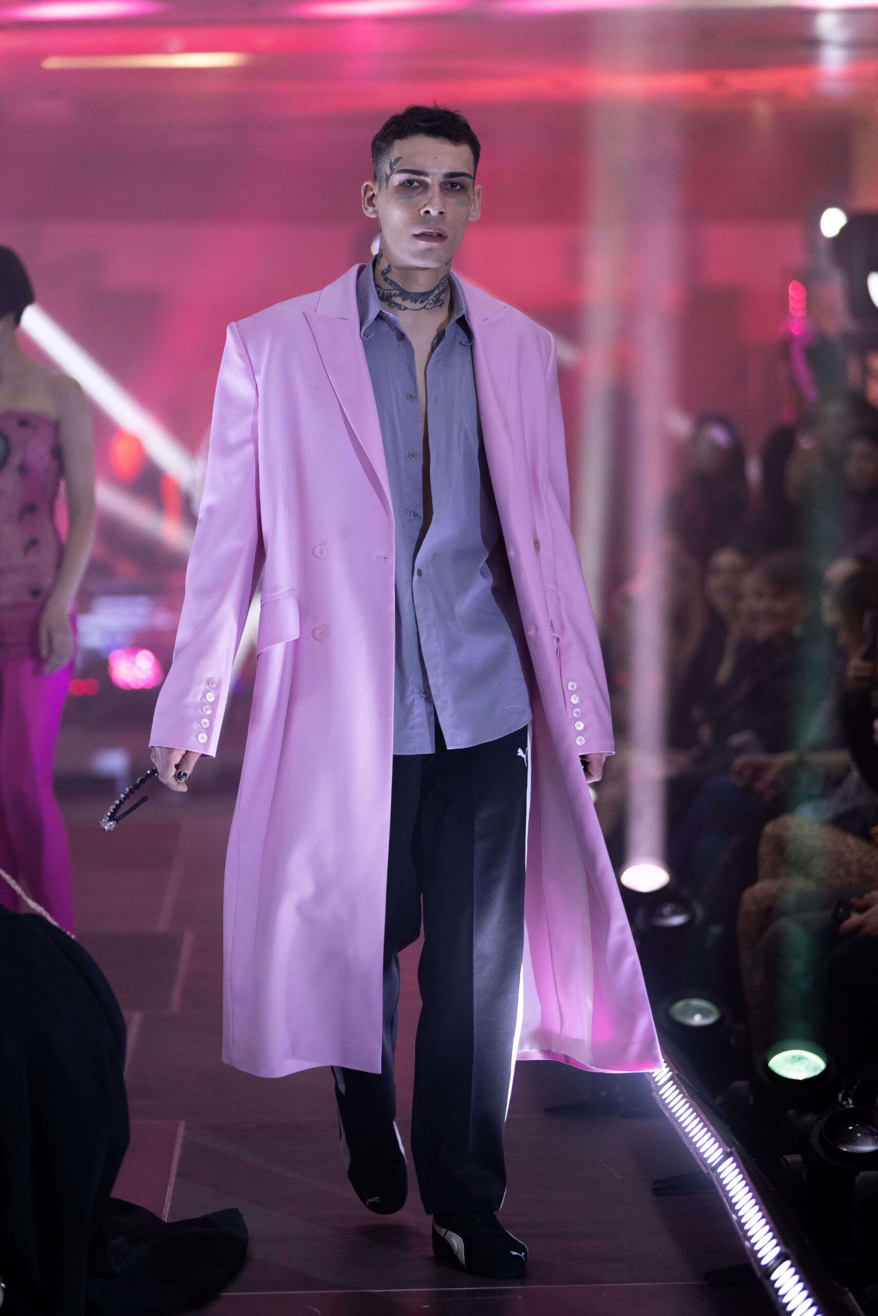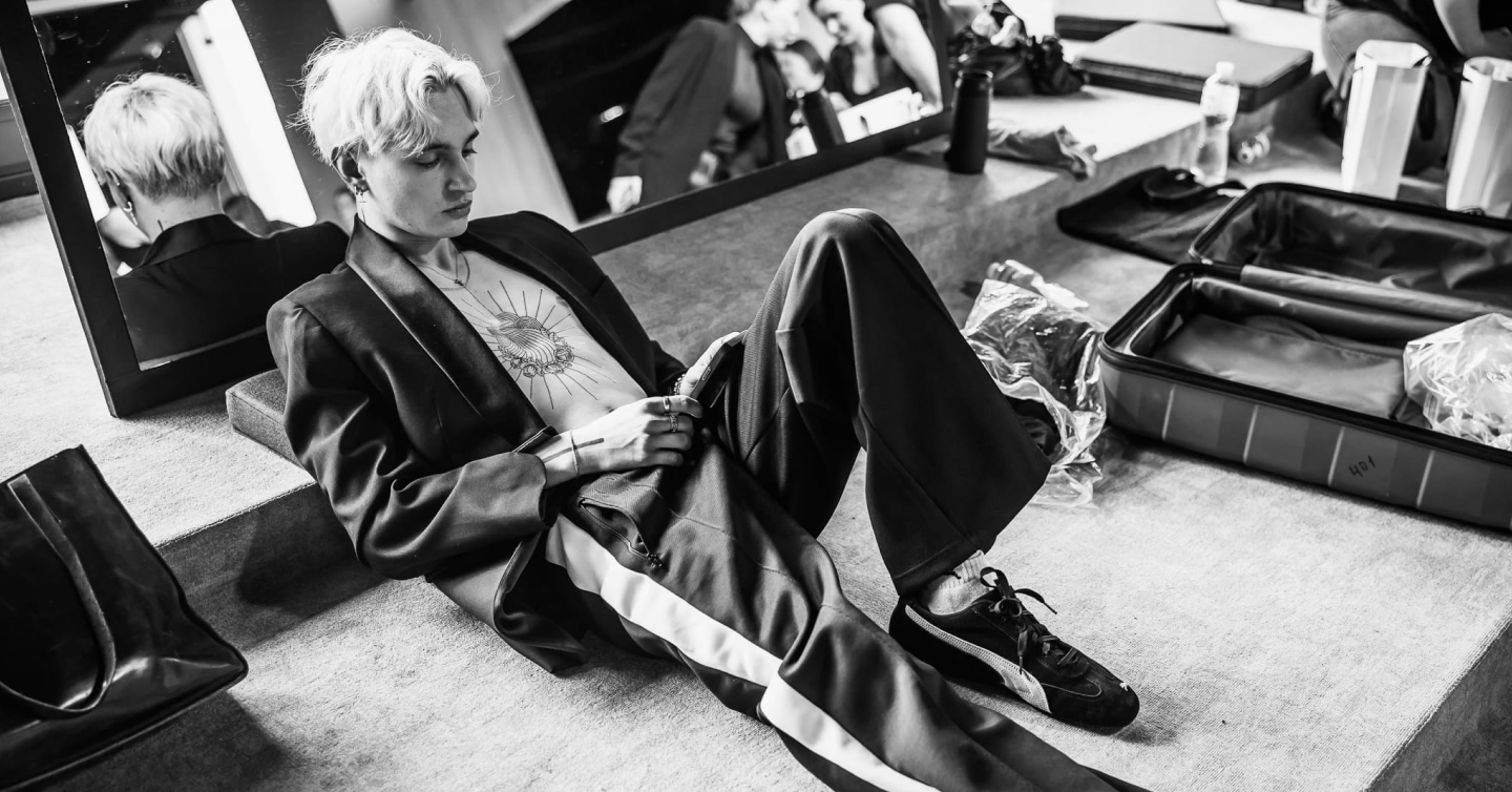 Одяг та кросівки PUMA інтегрували в окремі образи моделей та музикантів. Так чорно-білі ретро-кросівки PUMA Speedcat та спортивні штани, серед яких модель T7 Low Rise Track Pants із лампасами, поєднали в образі із класичним чорним піджаком і рожевим та білим тренчами.